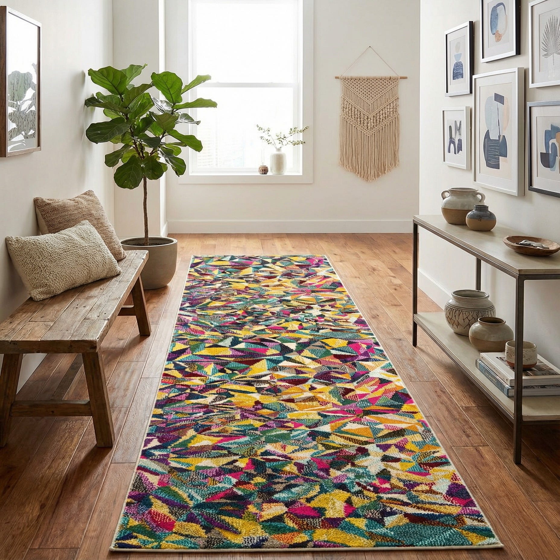 This runner brings color and rhythm to transitional and contemporary interiors alike — place it in a hallway or entry to energize long sightlines, layer it under a slim console in an eclectic living room, or use it to define a narrow home office or gallery corridor. It pairs well with solid navy or beige furnishings for balance, or with bold accent pillows and art for a vibrant, collected look.