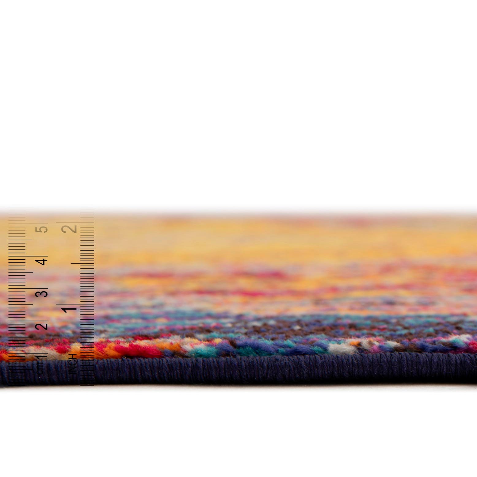 Bold, abstract medallions swirl across a multi-hued field in this machine-made runner crafted from 100% polypropylene. Rich indigo and deep blue form a dramatic backdrop for concentric bursts of yellow and orange, layered with pops of plum red, puce, pink, light blue and ivory. The pattern has a painterly, almost watercolor quality—two luminous, sunlike centers surrounded by mottled color that gives the rug movement and depth. The pile is low-to-medium with a dense, slightly plush hand that feels comfortable underfoot while maintaining a crisp, defined appearance to the printed motif.