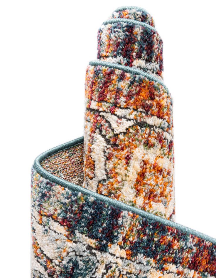 A vintage-inspired runner with a worn, layered look, this piece presents a central medallion and scrolling floral motifs softened by a distressed overlay. The multi-hued background blends warm oranges and reds with cooler blues, grays, and greens, while accents of ivory, beige and touches of black punctuate the pattern for definition. Machine-made from polypropylene and polyester, the surface has a low, dense pile that feels soft underfoot and offers a slightly cushioned hand that follows the rug’s intricate, antique-style pattern.
