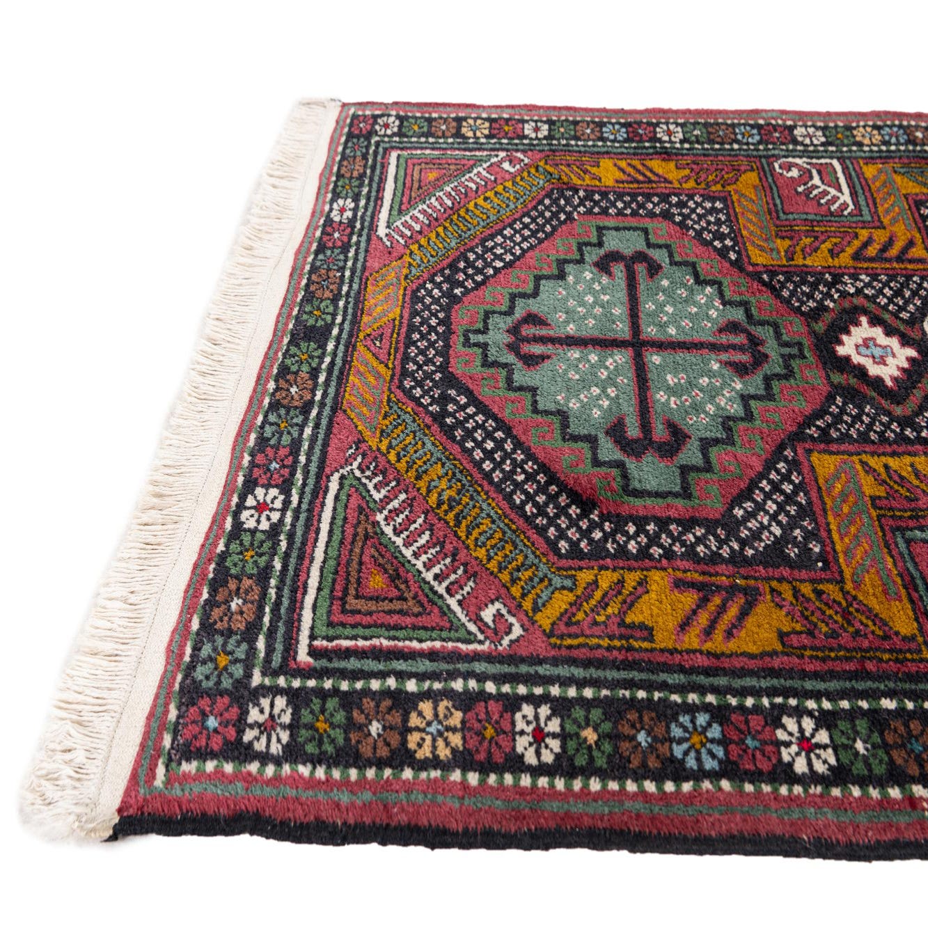 A 10 ft multi-colored wool runner rug with a traditional Oriental pattern, featuring geometric shapes in red, green, and gold, perfect for a hallway.