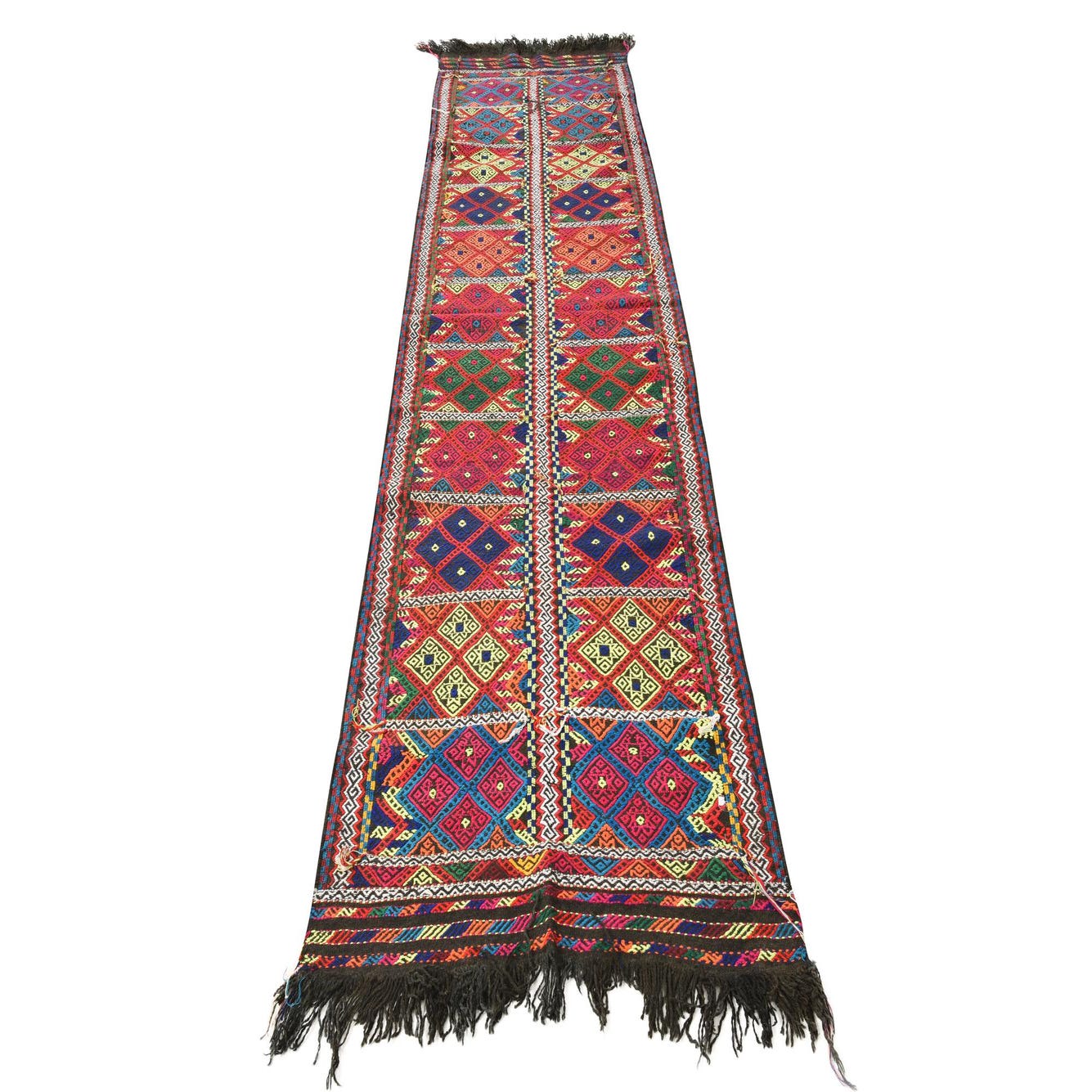 A vibrant 10 Ft Kilim Fars runner rug with a multi-colored Persian tribal pattern, featuring geometric diamonds and stripes, handmade from wool.