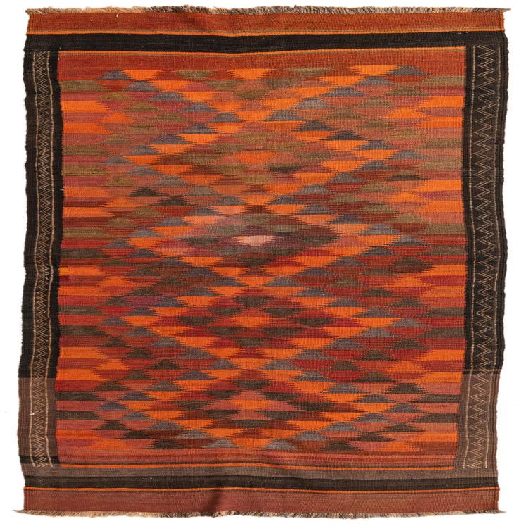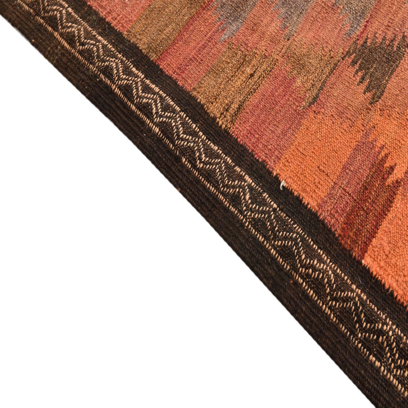 A 10 Ft Kilim Fars runner rug with a vibrant, multi-colored tribal pattern featuring orange, red, and brown geometric shapes.
