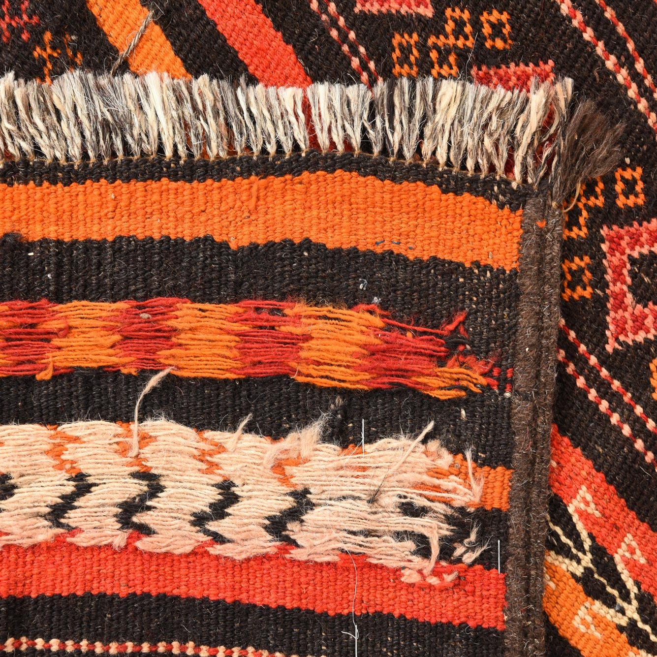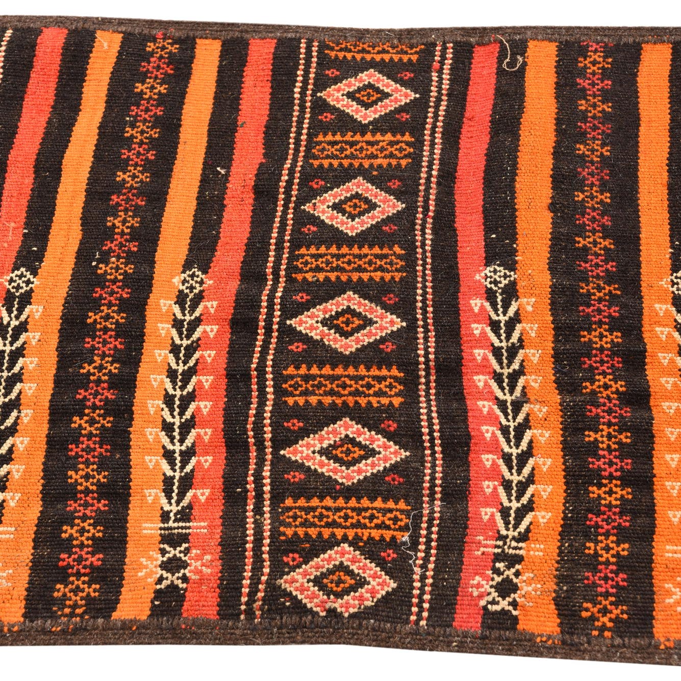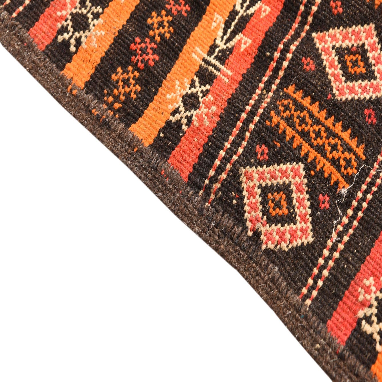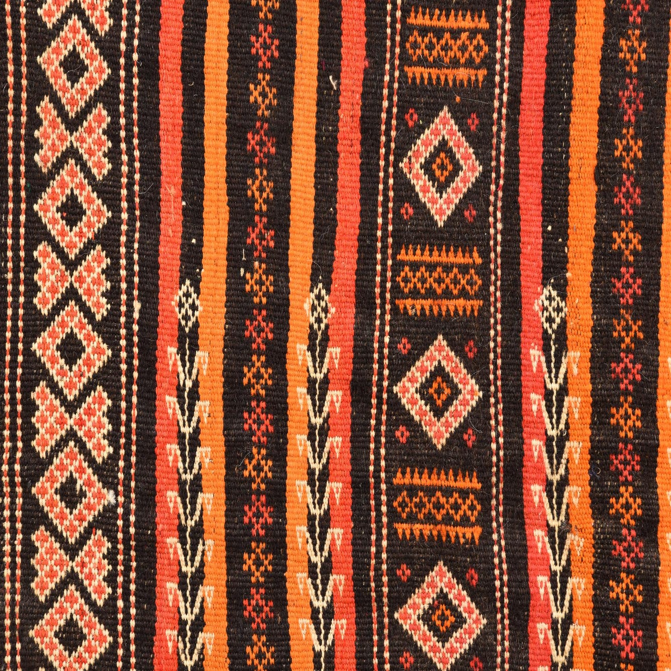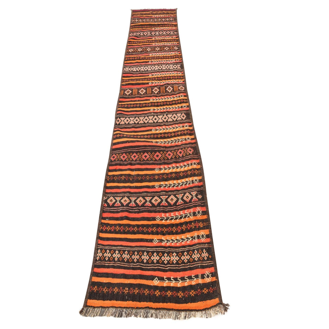The Kilim Fars collection presents a 10 Ft Runner rug, handwoven from 100% wool, ensuring a product that boasts both durability and comfort underfoot. This piece exhibits a distinctive pattern typical of Kilim design, characterized by geometric motifs and stripes that offer visual interest and textural depth. Colors included in this rug are a dynamic range of Multi, Black, Brown, Orange, Red, Ivory, and Burgundy against a background color that is best described as Multi. This amalgamation of colors furnishes a vibrant yet harmoniously balanced aesthetic.