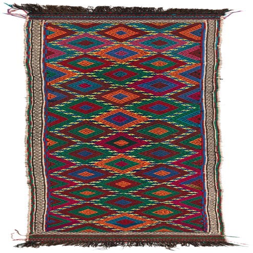 Each color is confidently applied, contributing to the rug's overall energetic and eclectic appearance. The fringe on either end adds a classic finish to this semi-antique piece, which carries a history spanning 40 to 60 years, suggesting a durable resilience as much as a depth of character.