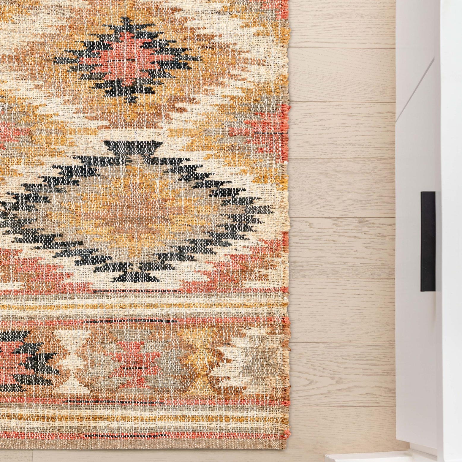 A 10 ft multi-colored Southwestern runner rug with geometric patterns in black, red, yellow, and natural jute tones.