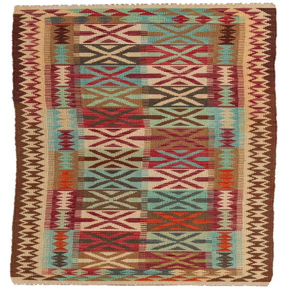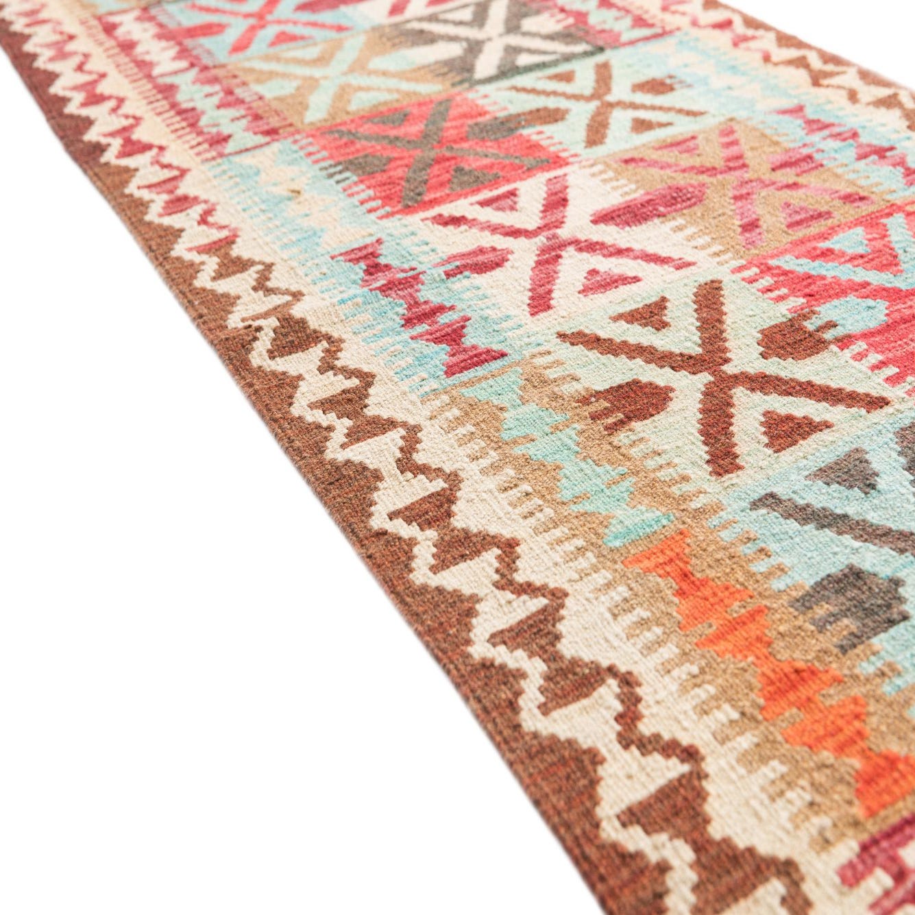 Hand-woven of 100% wool, this flatweave kilim runner presents a repeating grid of bold geometric X-motifs set on a multi background. Each square alternates warm and cool tones — beige, blue, brown, light green, red and maroon — creating a lively, balanced palette. Stepped and zigzag borders run the length of the piece, and a short fringe at each end provides a finished, handcrafted look. The tight, flat weave produces a low-profile surface with a slightly textured, firm hand that highlights the clear geometric pattern.