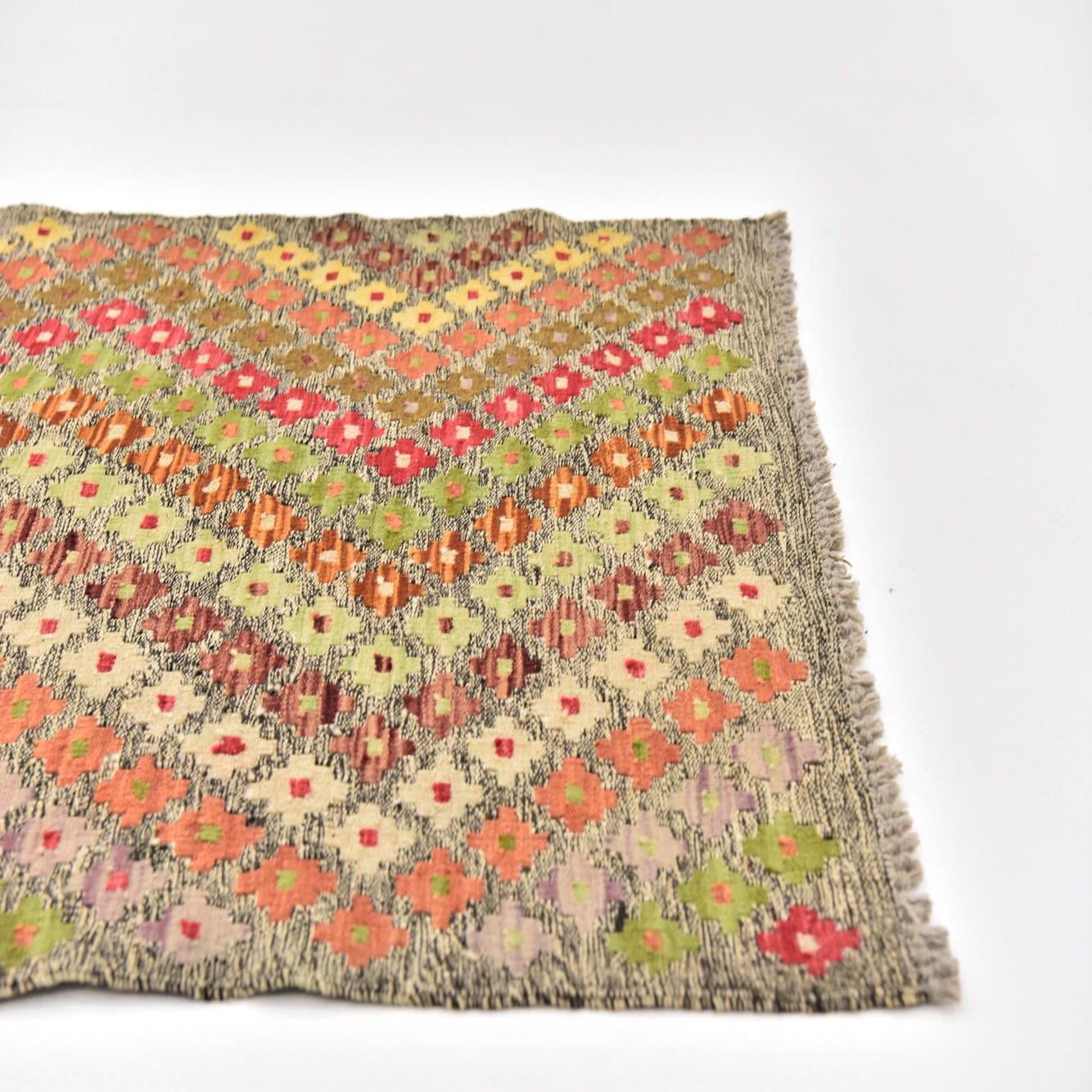 This Kilim runner would complement an interior that appreciates a mix of modern and traditional elements. It can serve as a unifying piece in an eclectic living space, or add warmth and color to minimalistic or industrial decor. With its earthy tones, it could also enhance bohemian-style homes, pairing well with natural wood furniture and a variety of textiles. The vibrant colors and bold pattern make this runner a statement piece that could anchor a hallway or define a space within a larger room.