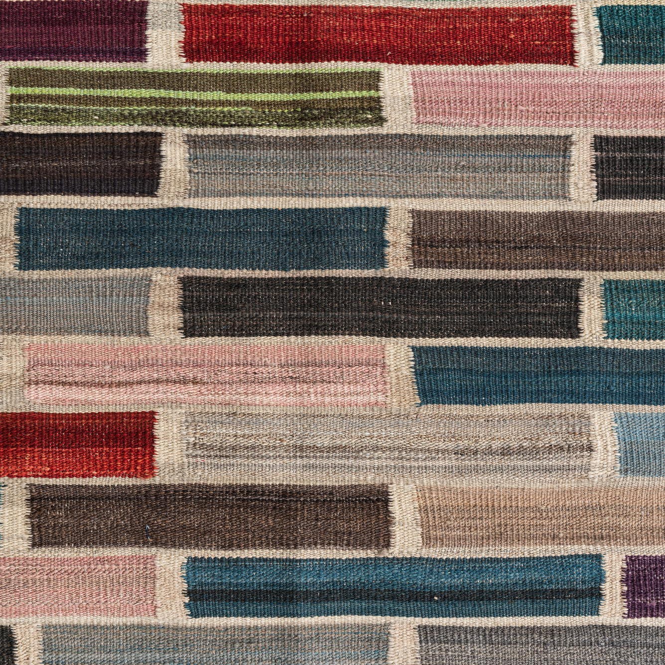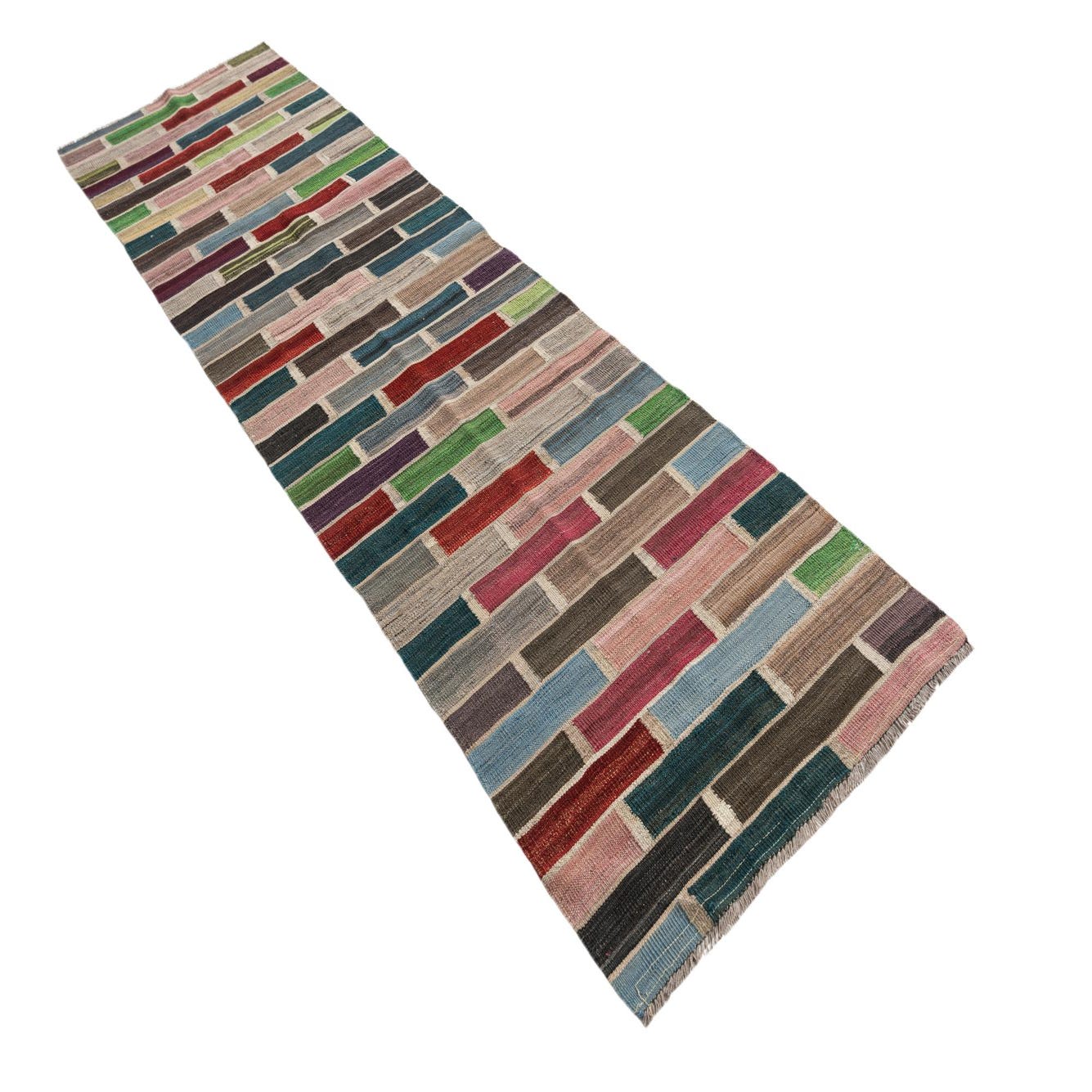 Hand-woven from 100% wool, this flatwoven runner presents a layered, brick-like pattern of staggered rectangular bands across a multi-hued ground. The palette balances warm neutrals—beige, brown and gray—with vibrant accents of blue, light blue, green, light green, purple and red. The low-profile weave feels slightly textured underfoot, with a firm, tactile hand and short fringed ends that underscore the piece’s handcrafted character.