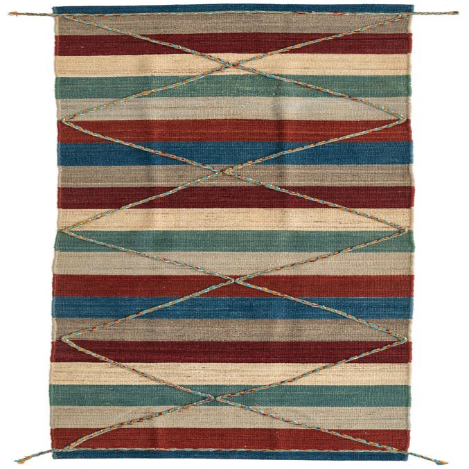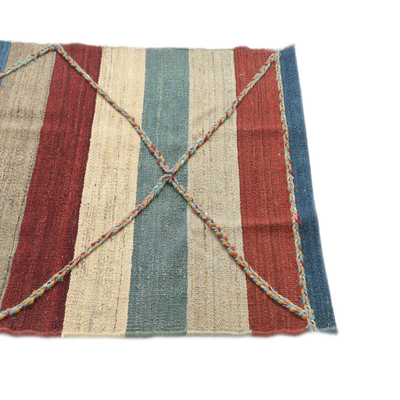 Hand-woven from 100% wool, this flatwoven runner presents broad, horizontal bands across a multi background in warm beige, rust red, blue, brown, and green. A braided, multicolored cord is woven atop the stripes in a linked diamond pattern, adding a handcrafted, geometric accent. The low-pile surface has a firm, tactile feel with subtle variations and natural slubs that give the piece visible texture and depth.