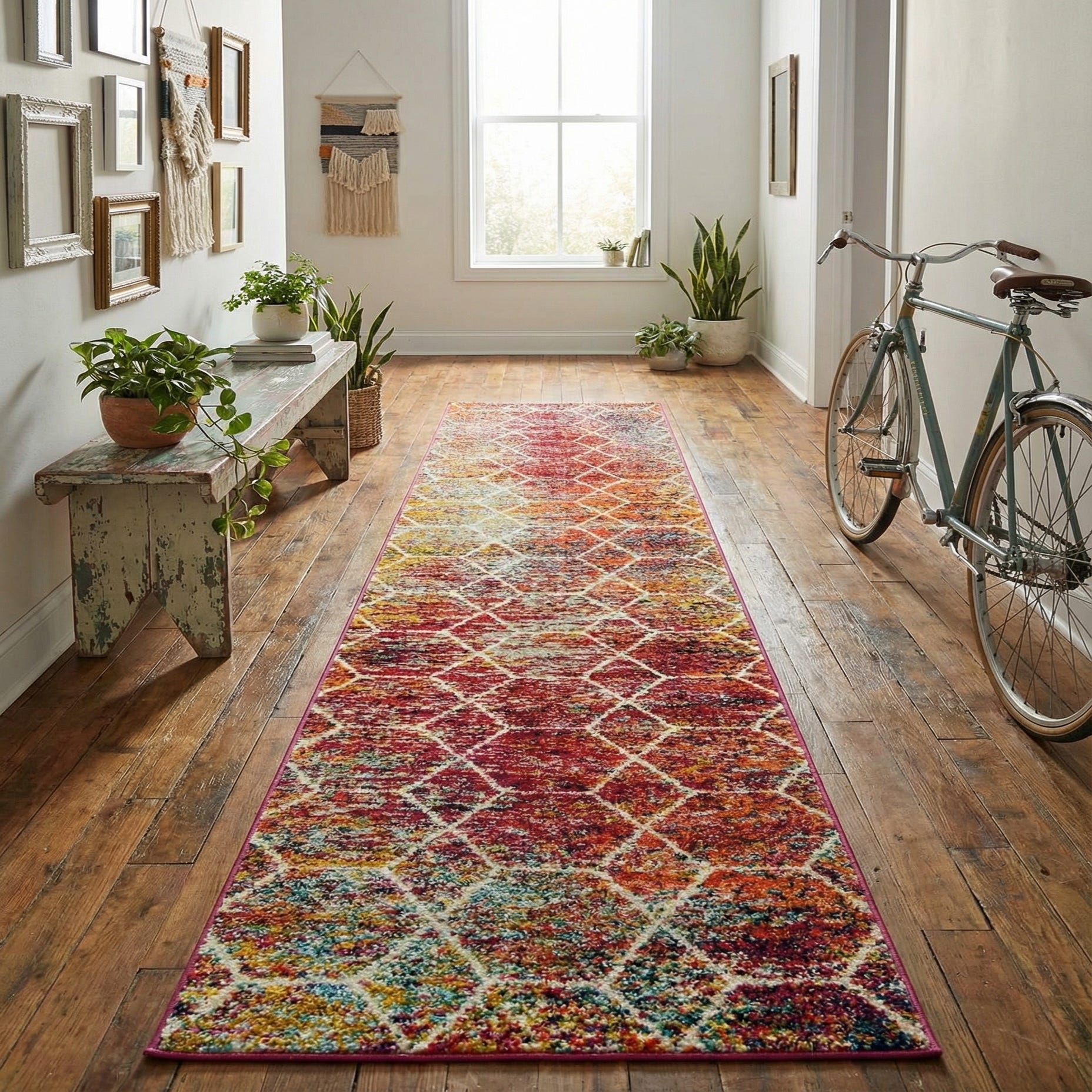 Machine made from 100% polypropylene, the pile feels soft underfoot with a modest density that cushions while maintaining a low profile for high-traffic areas. Use this runner to energize a hallway or galley kitchen, anchor a colorful entryway, or add warmth and pattern alongside a bed in an eclectic or modern living space. It pairs well with neutral furnishings to let the colors pop, or with layered textiles and mixed finishes for a more bohemian, collected look.