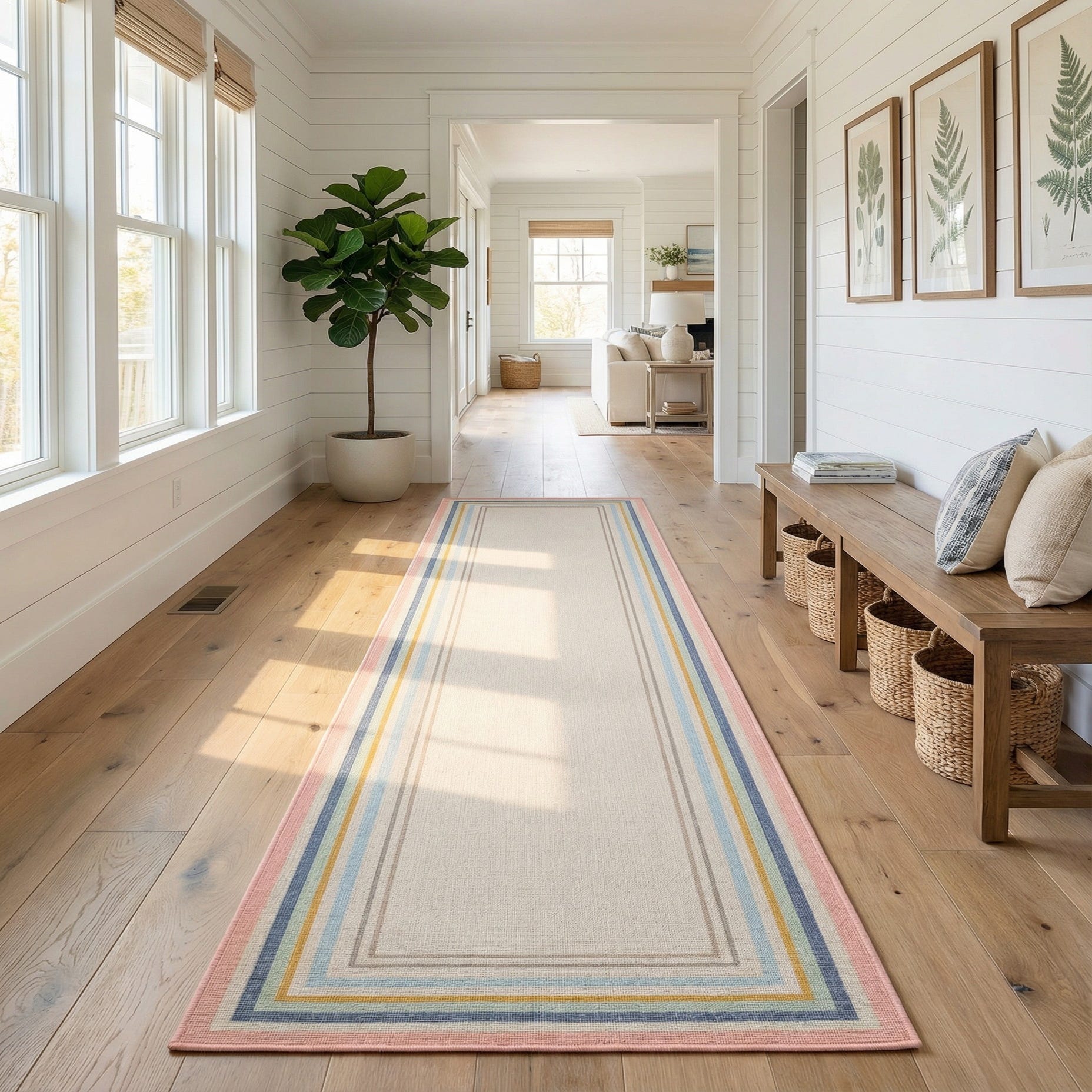 With its stain-resistant and shed-free properties, this rug is an ideal addition to high-traffic areas inside the home. The harmonized color palette and simple framing pattern allows for versatility in interior design, making it appropriate for a variety of spaces such as hallways, entryways, or as a connector between open-plan living areas. It can easily integrate into contemporary, modern, coastal, or Scandinavian inspired decors, offering both function and form. Its elongated runner shape also makes it suitable to enhance the aesthetic of narrow or long spaces while providing a visual pathway.