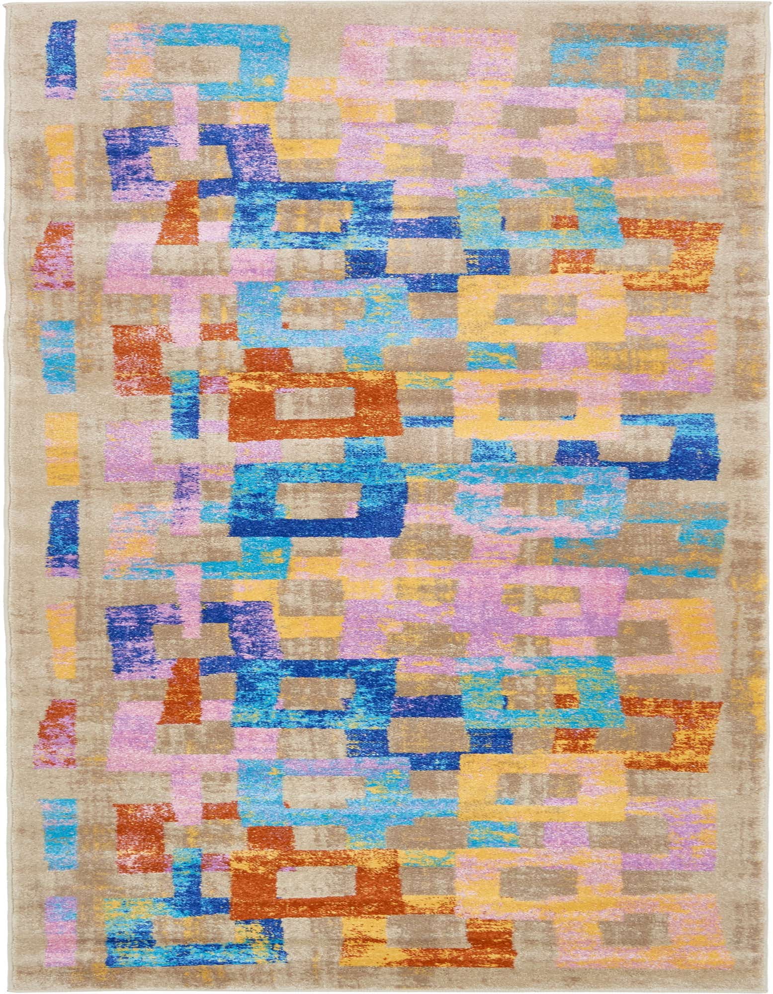 Primary color is Multi. Colors in this rug include: Multi, Blue, Light Brown, Orange, Purple, Yellow, Pink, Beige.
