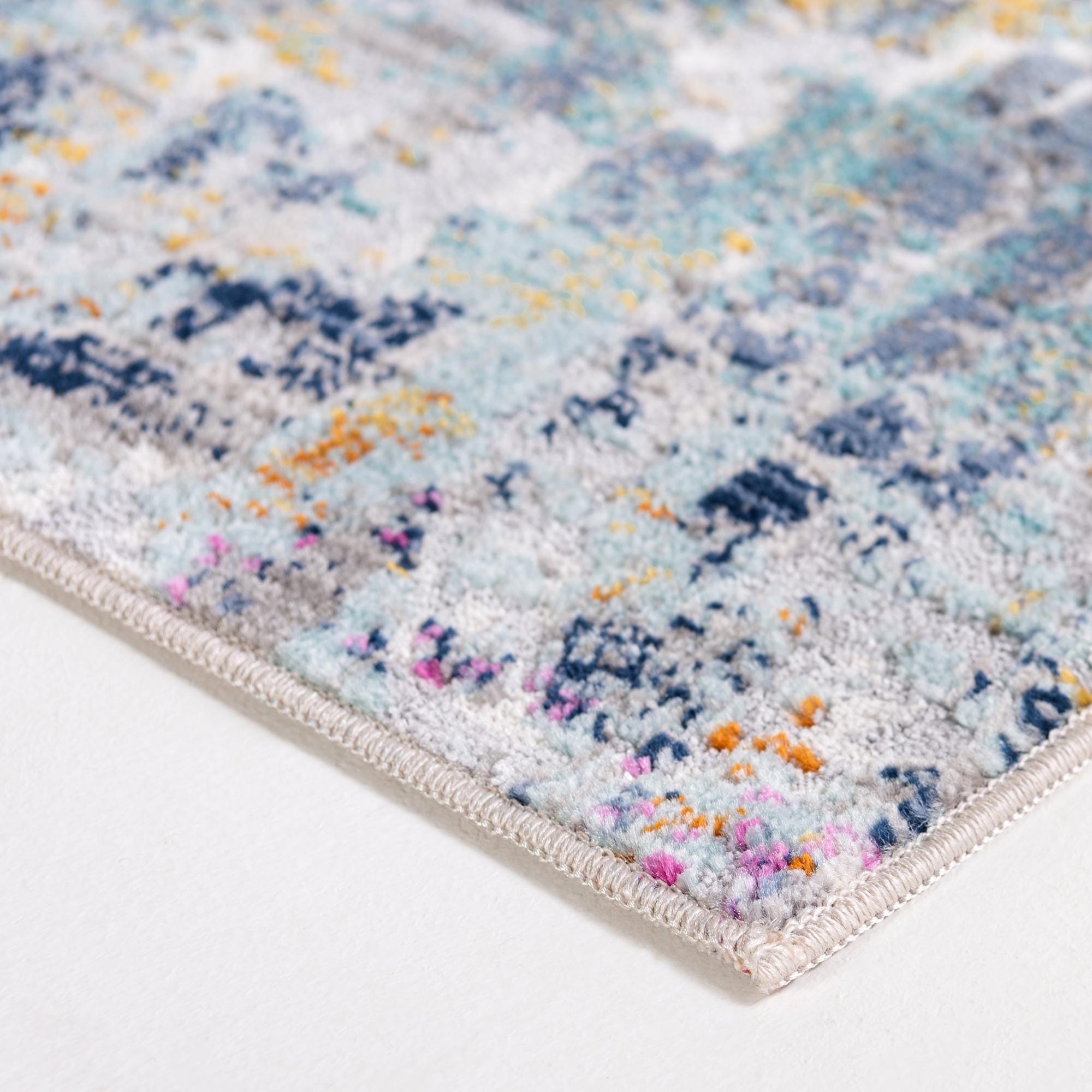 A vibrant, layered abstract design brings energy and depth to the floor with a multi-colored background that blends blue, turquoise, gold, gray, ivory, orange and purple. The pattern reads like a modern, distressed tapestry — painterly washes of color intermix with faint floral and scroll motifs for a lived-in, artistic look. Machine made from 70% polypropylene and 30% polyester, the rug has a low-profile texture with a soft, slightly dense hand that lays flat underfoot and lets the colors and pattern read clearly from a distance.
