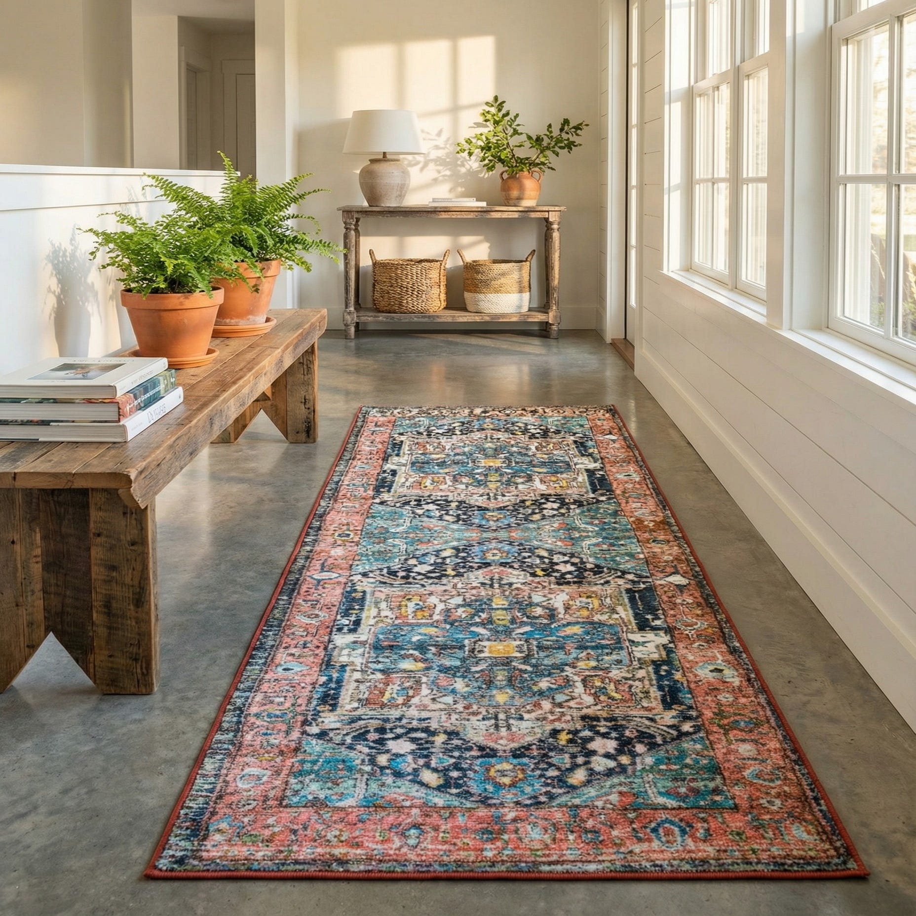 Machine-made from polyester, the surface has a low, soft pile that feels smooth underfoot and shows the color variations with a gentle sheen. It works well in a range of interiors — pair it with warm wood floors and neutral seating for a classic transitional look, layer it in an eclectic or bohemian hallway with mixed textures and brass accents, or use it to add color and pattern to a kitchen or narrow foyer. The runner’s mix of warm and cool tones makes it easy to coordinate with navy upholstery, light linens, or painted cabinetry.