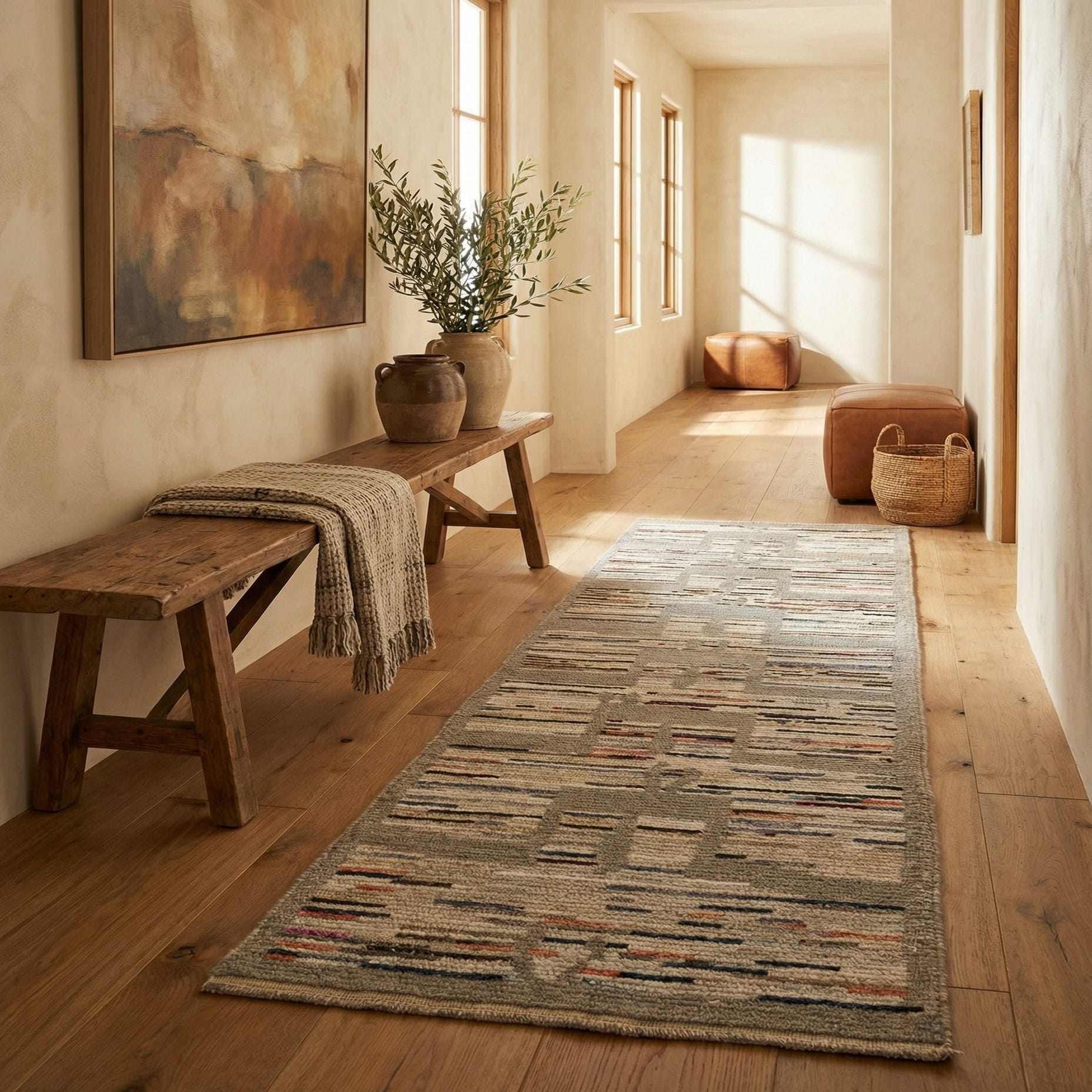 The rug’s geometric yet relaxed pattern works well in contemporary, transitional, or mid-century interiors. Use it to define a long hallway or entry, run alongside a bed to anchor a bedroom layout, or add interest to a kitchen galley. Pair with natural wood furnishings and neutral upholstery to let the colored threads function as accents, or coordinate with navy or charcoal pieces to echo the darker bands for a pulled-together look.
