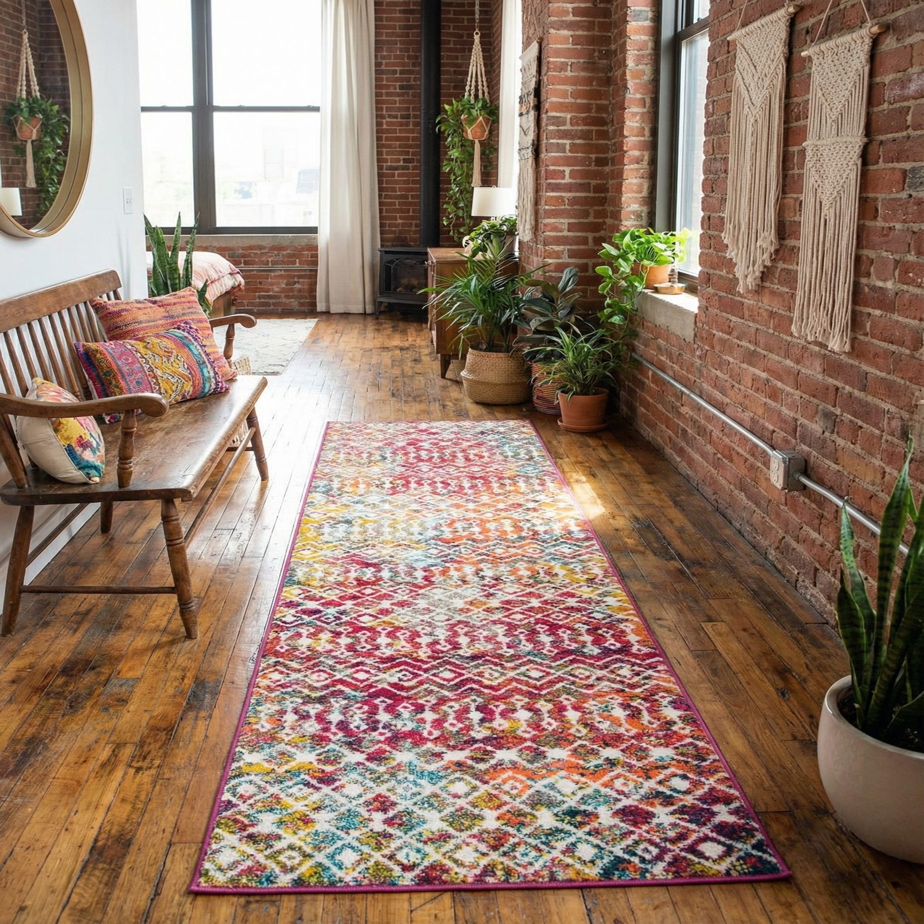 Cut in a runner format, this piece fits narrow spaces where a bold accent is needed—think hallways, entryways, alongside kitchen islands, or at the foot of a bed. It pairs well with warm woods, rattan or mid-century furniture and provides a lively counterpoint to neutral sofas or streamlined contemporary decor. Use it to introduce color into a calm palette or to complement layered, bohemian interiors that mix patterns and textures.