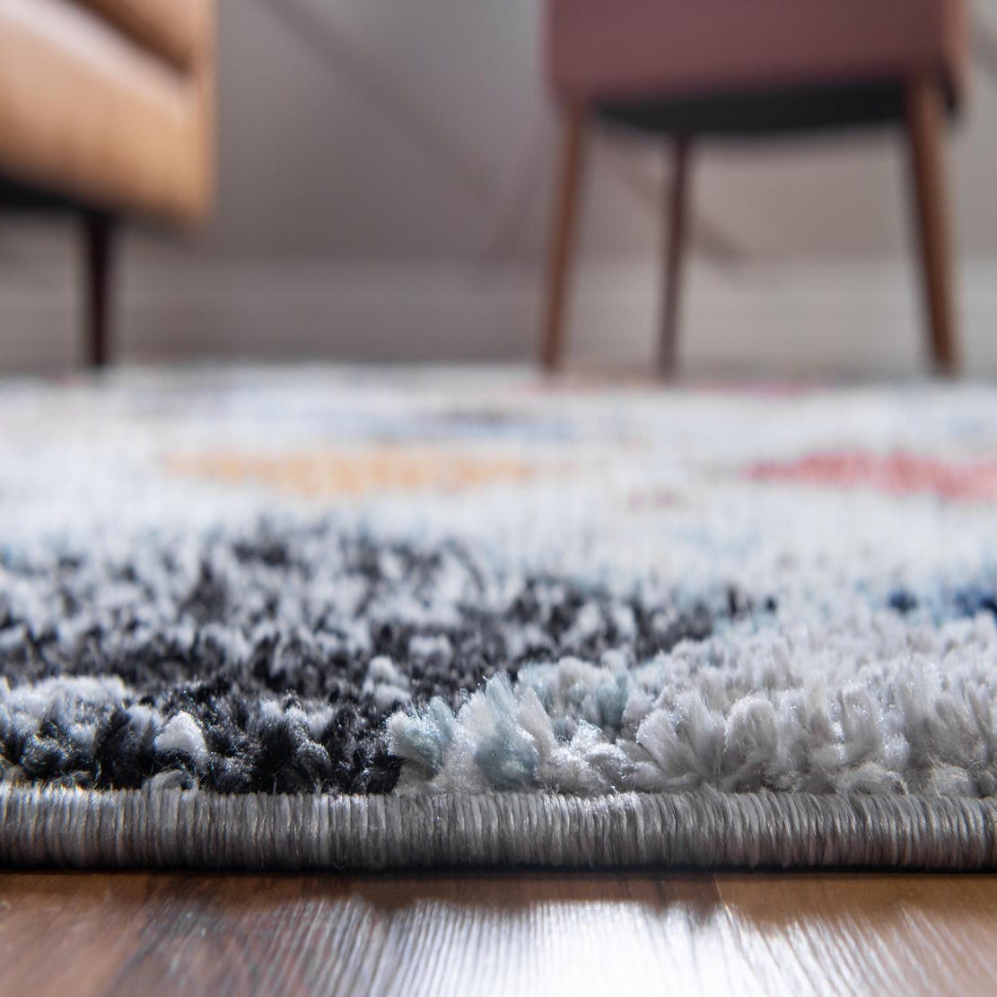 A 10 ft multi-colored runner rug with a bohemian tribal pattern of diamonds in red, pink, blue, and yellow on a textured gray and white shag pile.