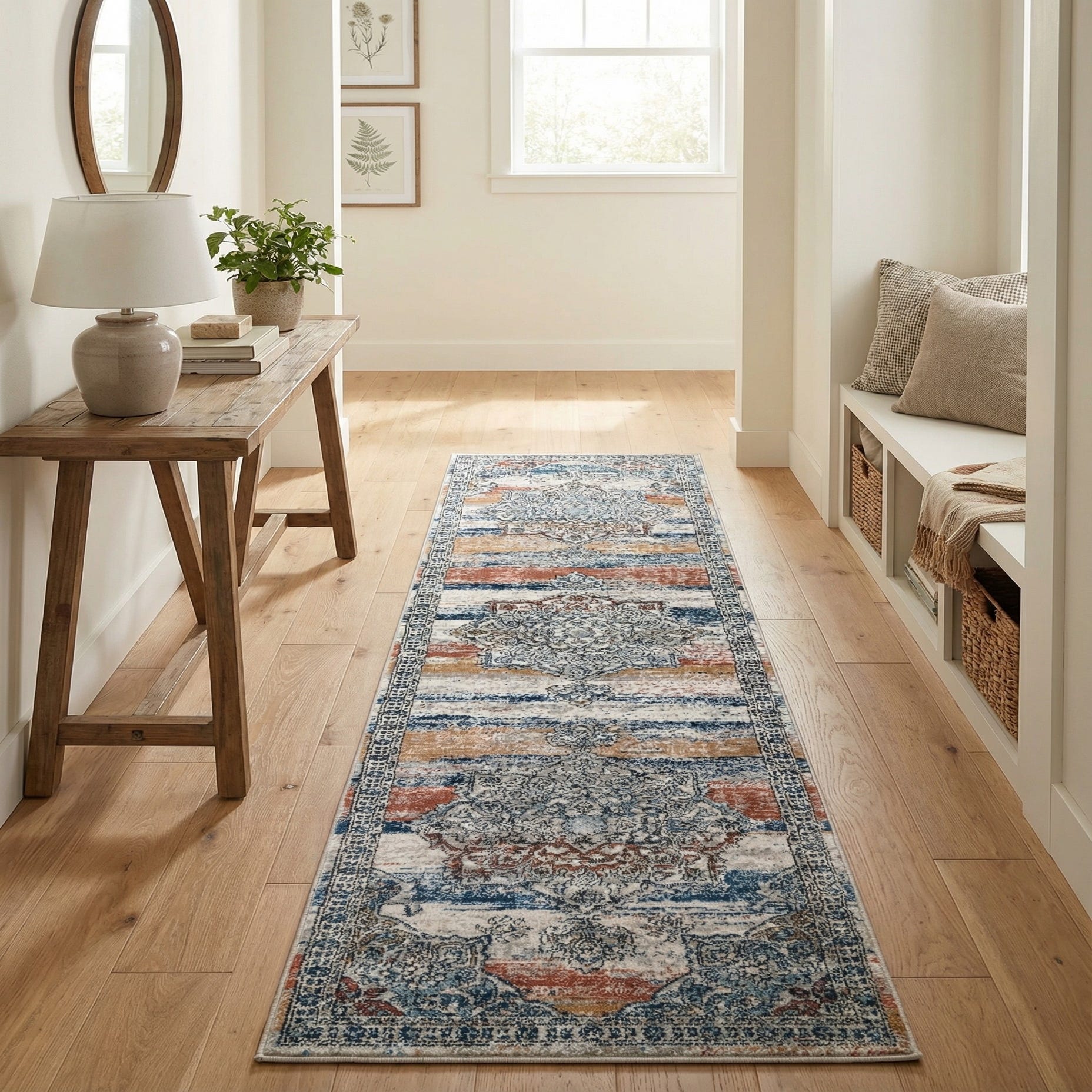 A 10 ft multi-colored runner rug with a distressed traditional medallion pattern in blue, rust, and gold tones, ideal for a hallway.