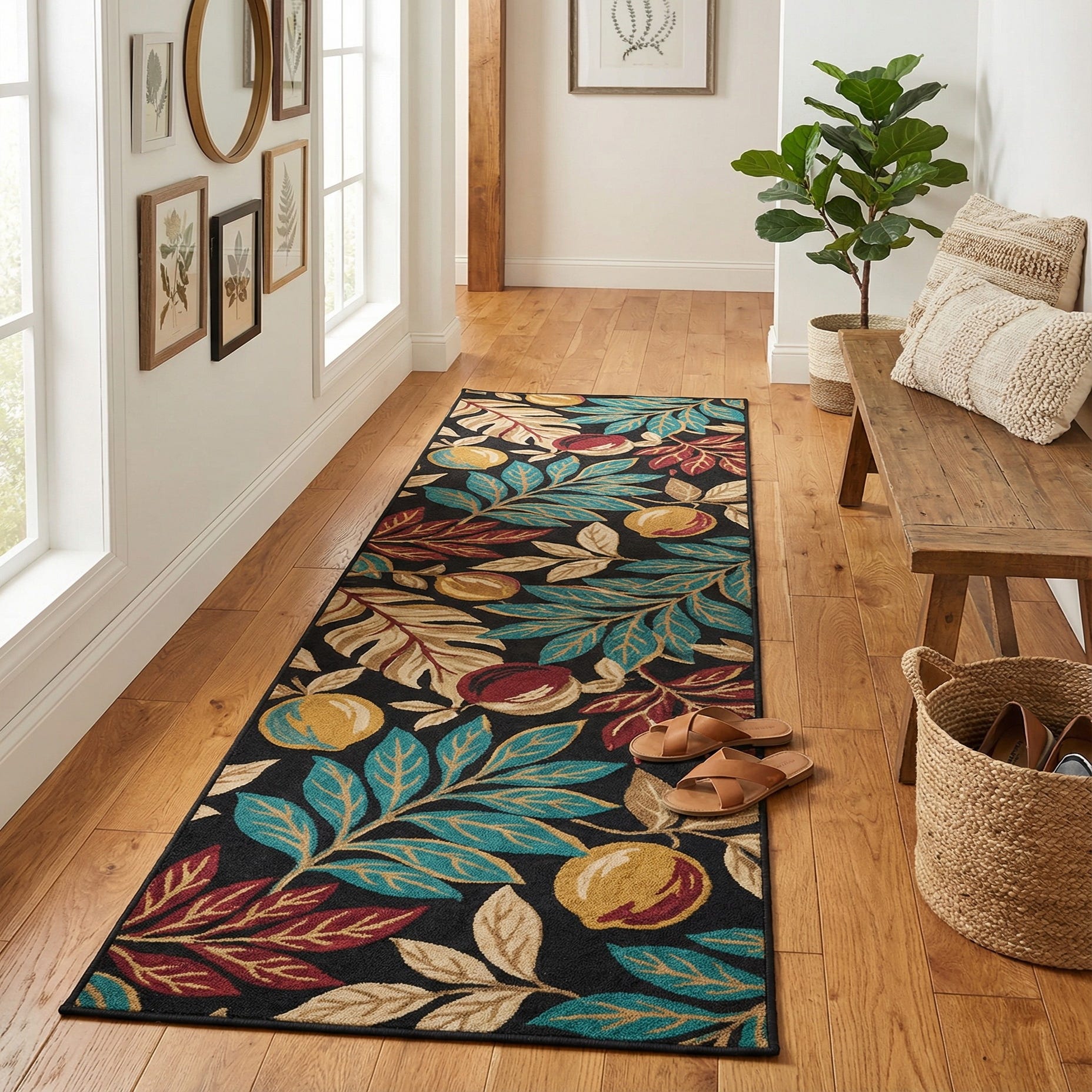 A 10 ft runner rug featuring a modern botanical pattern with large leaves in shades of green, yellow, orange, and red on a black background.