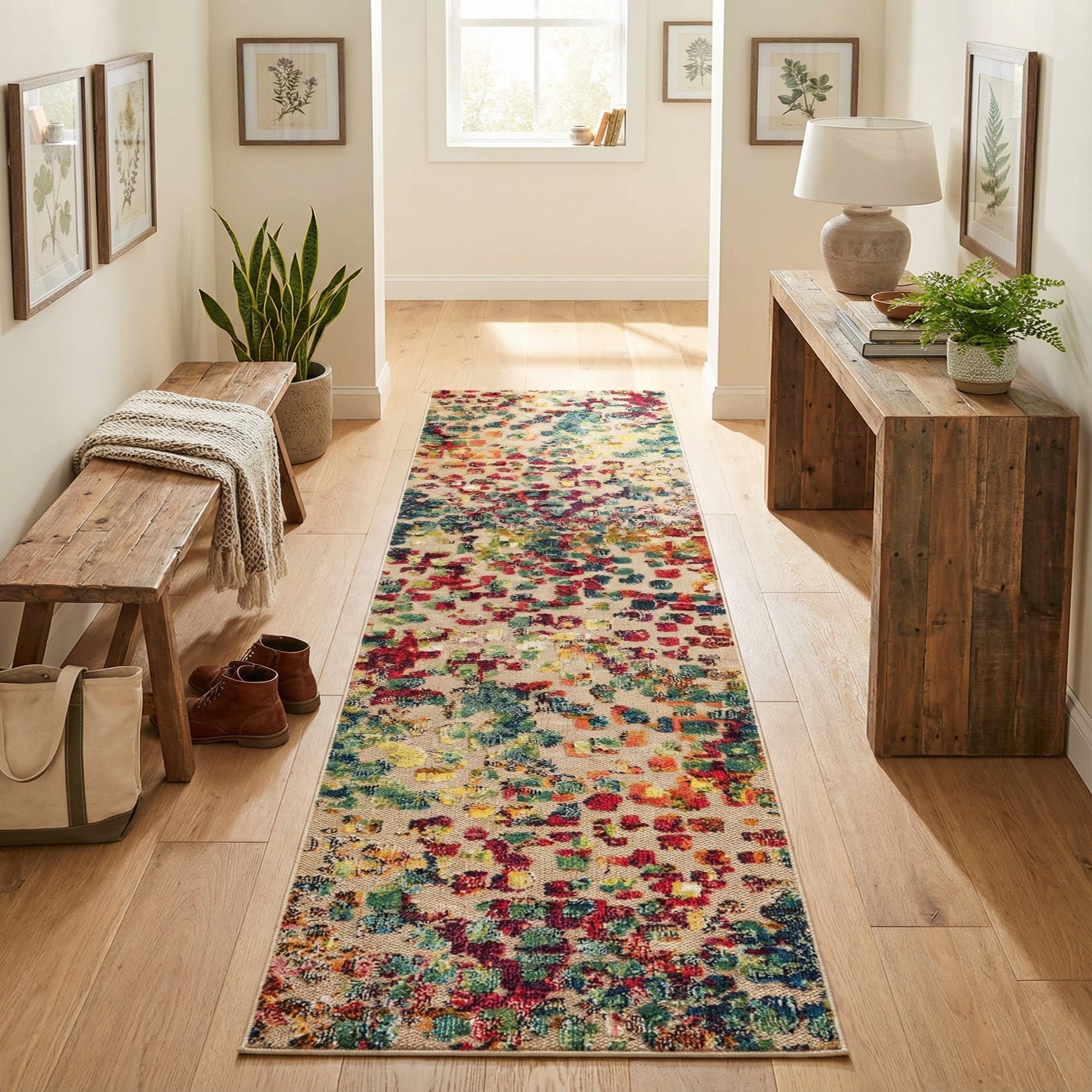 A 10 ft runner rug with a modern, multi-colored abstract pattern on a neutral background, suitable for a hallway or patio.