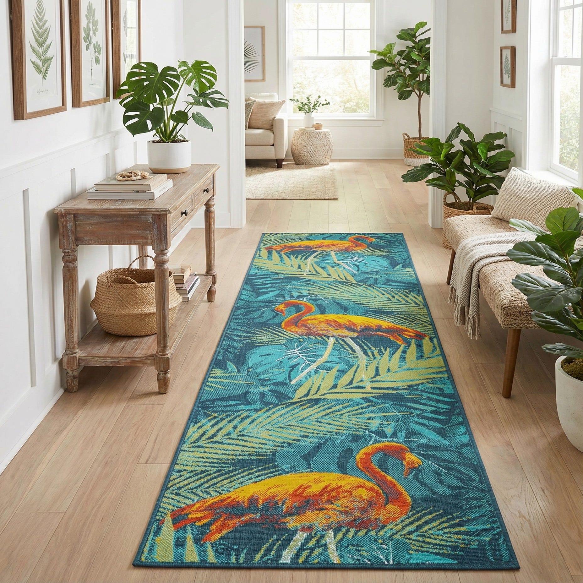 A vibrant 10 ft runner rug featuring a repeating pattern of orange flamingos amidst teal and lime green tropical leaves, suitable for a hallway or patio.