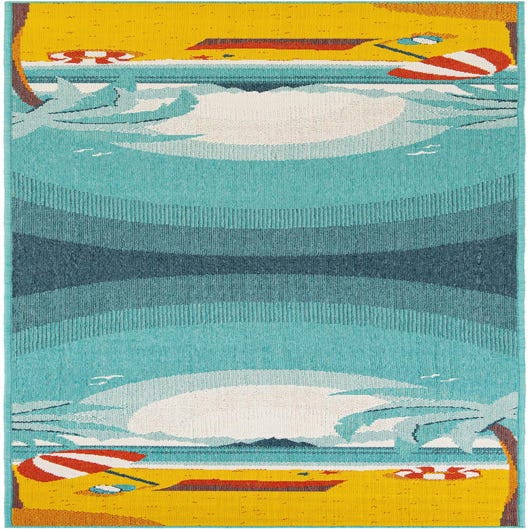 A vibrant 10 ft runner rug depicting a beach scene with palm trees, a large sun, and beach umbrellas on yellow sand and blue water, suitable for a patio or hallway.
