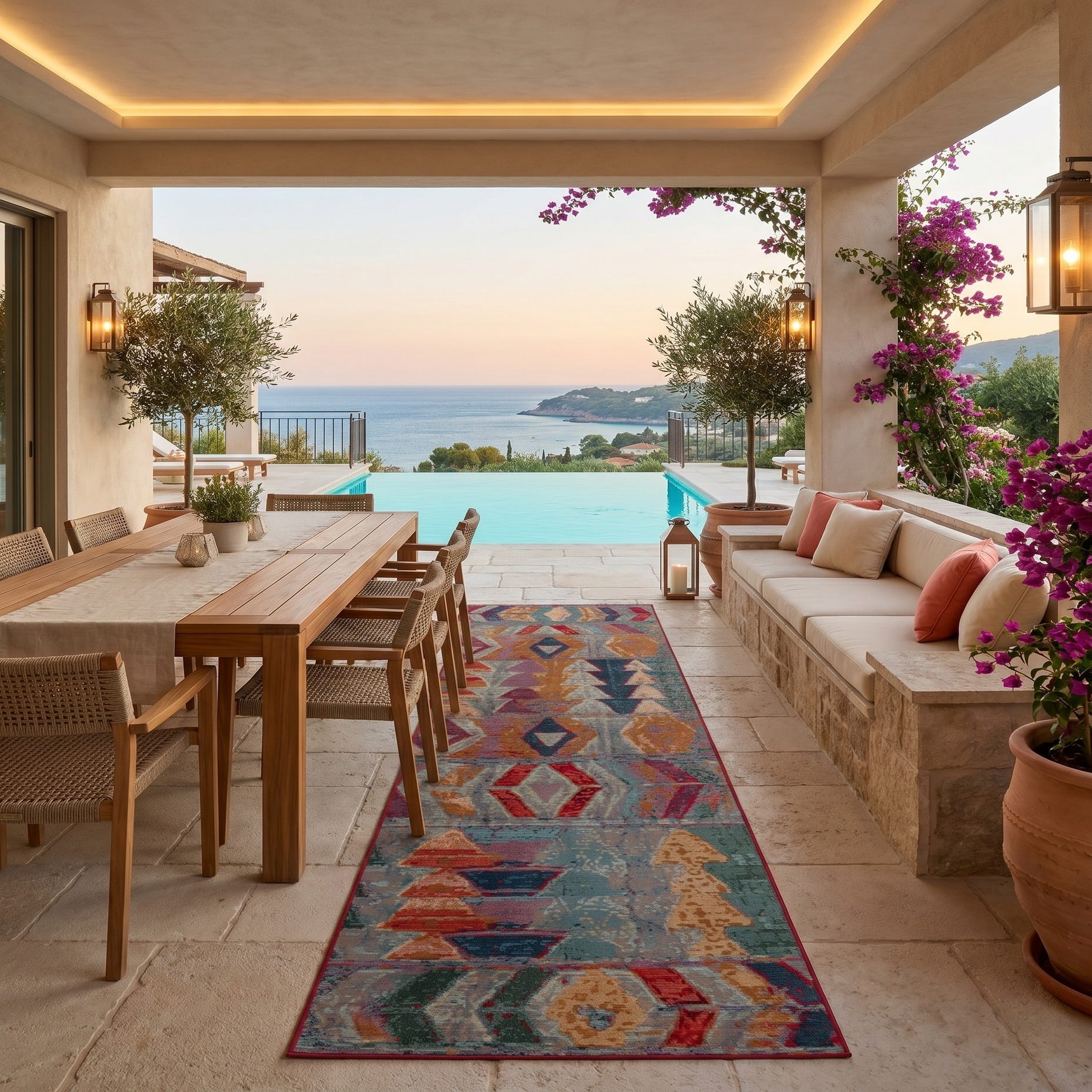 Fell in love with this rug when I saw it on-line for its delightful pattern and vivid colors. It arrived in two days from the day ordered about a week ago. We put it down on our renovated deck today...it is even more awesome than we thought it would be! The colors and pattern outset the colors of the deck perfectly.