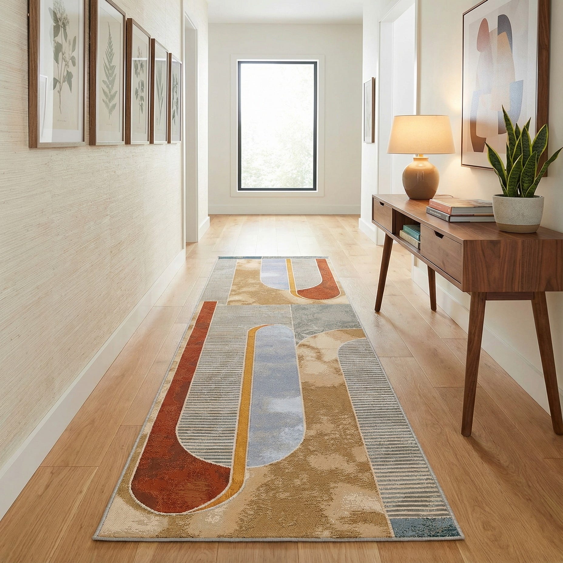 Works well in narrow rooms where you want a contemporary focal line—think entryways, hallways, kitchens or a covered porch. Pair it with natural wood furniture and matte metal or brass accents for a modern-meets-warm palette, or let it anchor a mid-century inspired corridor alongside clean-lined seating and neutral upholstery. The linear motif helps guide the eye through a space while the mixed warm and cool tones allow it to coordinate with both earthy and light, airy interiors.