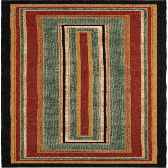 Primary color is Multi. Colors in this rug include: Multi, Black, Brown, Terracotta, Green, Ivory, Gold.