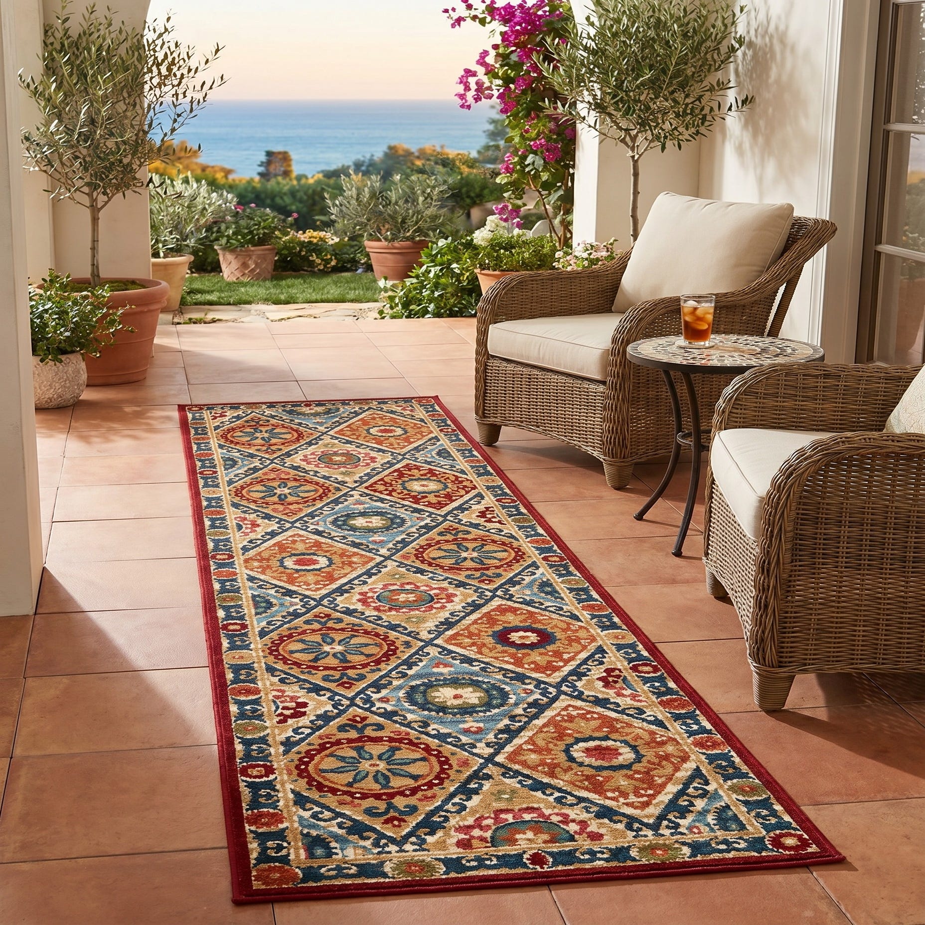 Fell in love with this rug when I saw it on-line for its delightful pattern and vivid colors. It arrived in two days from the day ordered about a week ago. We put it down on our renovated deck today...it is even more awesome than we thought it would be! The colors and pattern outset the colors of the deck perfectly.
