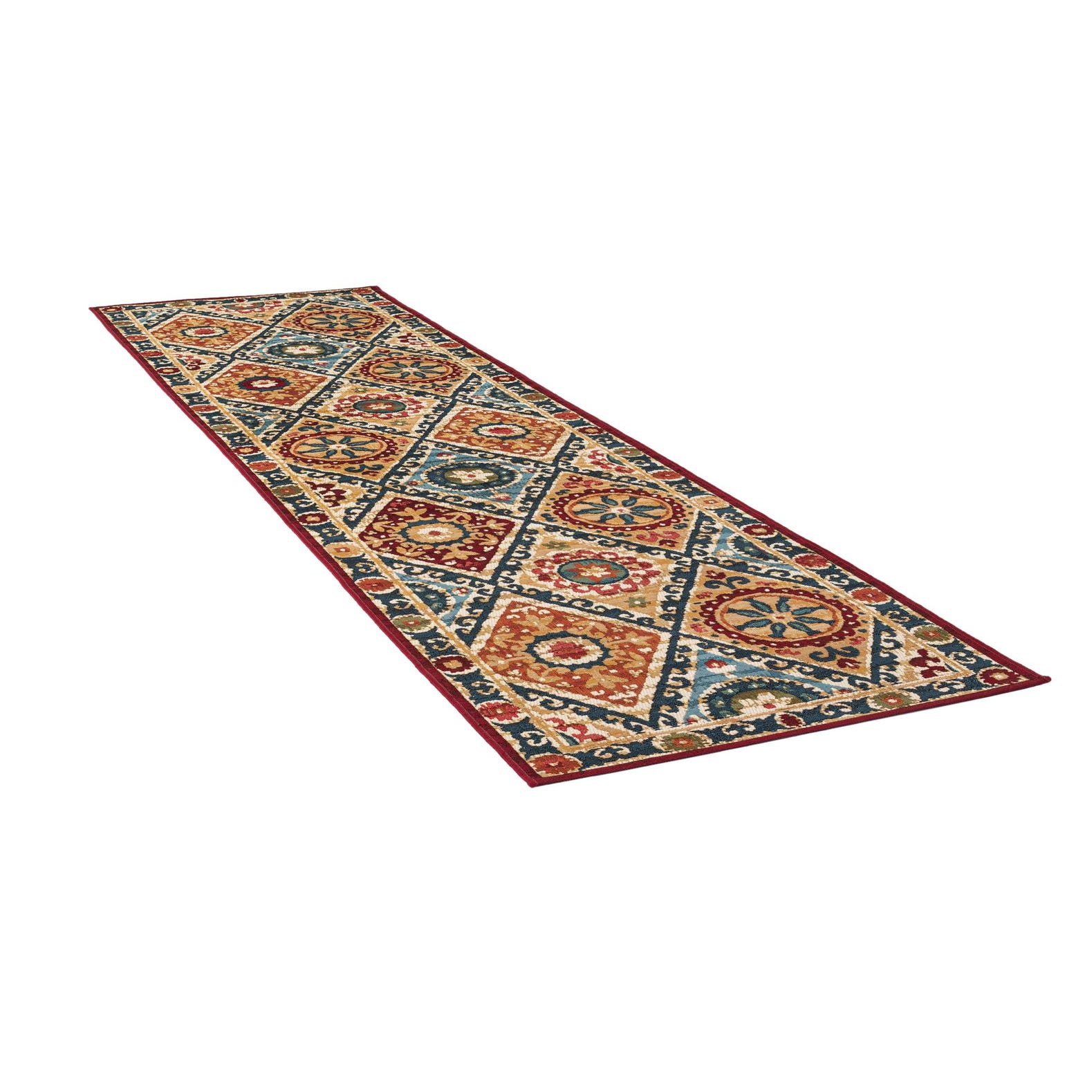 A 10 ft runner rug with a multi-colored modern pattern, featuring diamonds and medallions in blue, red, orange, and gold, suitable for a hallway or patio.
