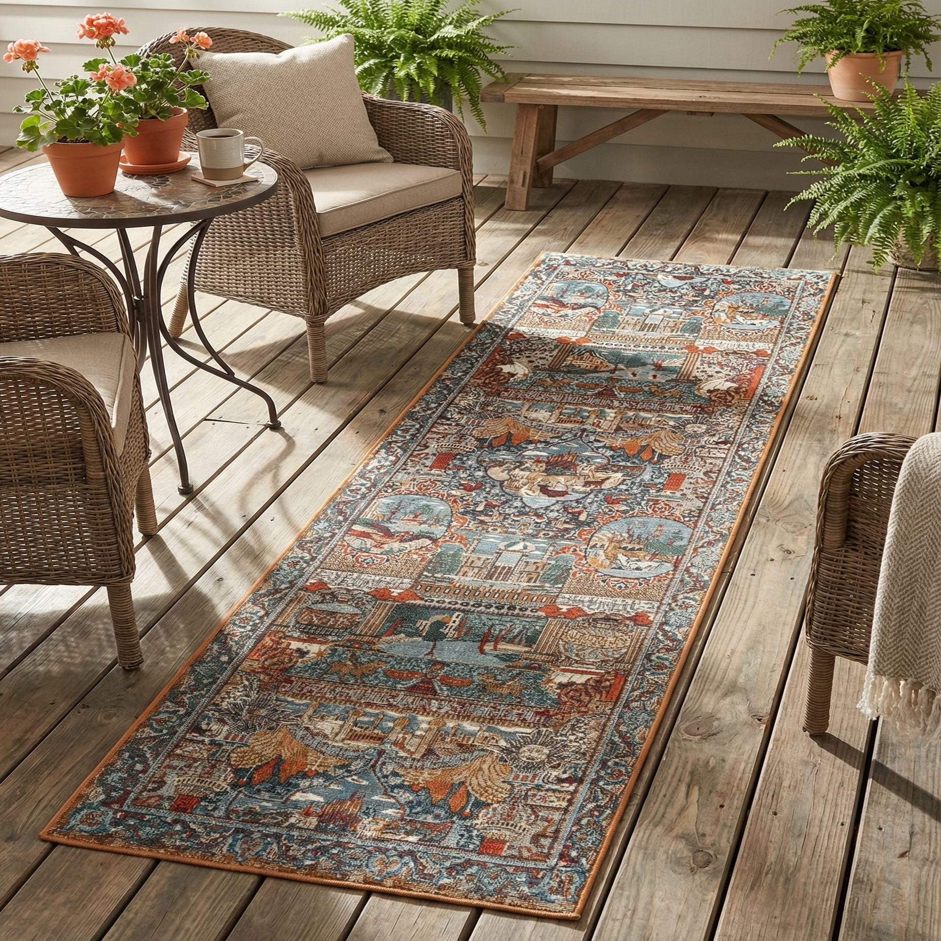 A multi-colored 10 ft runner rug with a detailed traditional pattern featuring architectural scenes and nature motifs, suitable for a hallway or patio.