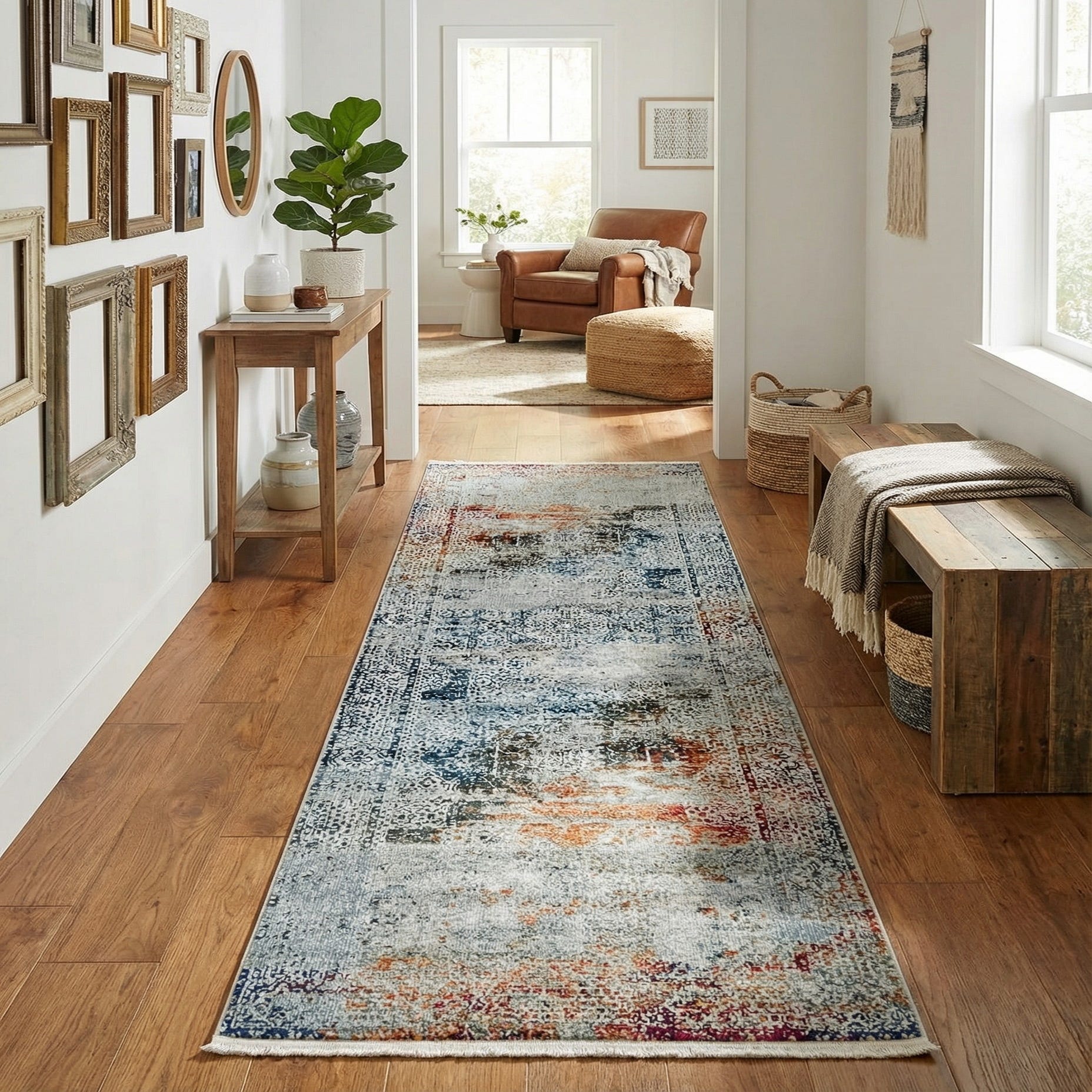 Ideal for hallways, entryways, or narrow kitchen aisles, this runner complements transitional and modern farmhouse interiors as easily as eclectic or bohemian schemes. Pair it with warm wood floors and neutral upholstery to let the colors sing, or use it to introduce subtle color contrasts alongside linen sofas, painted cabinets, or matte metal accents. The muted palette and distressed detailing make it a versatile anchor for layered, casual spaces that benefit from a bit of pattern and color without overpowering the room.