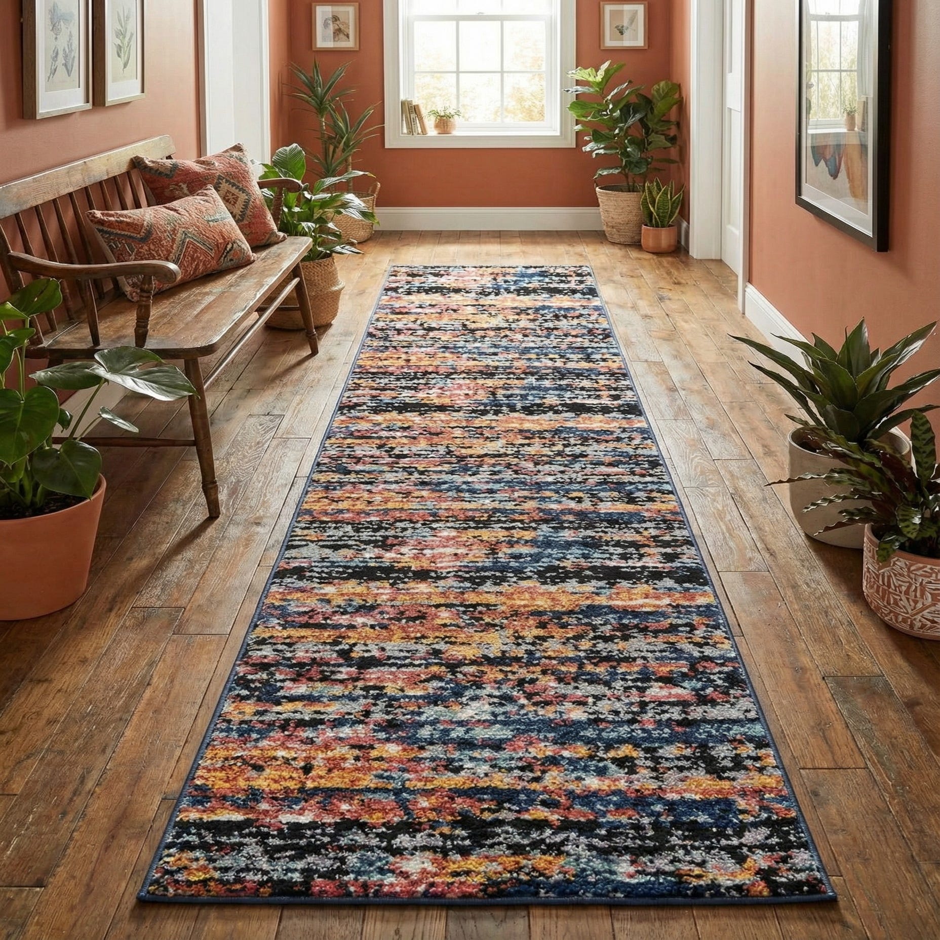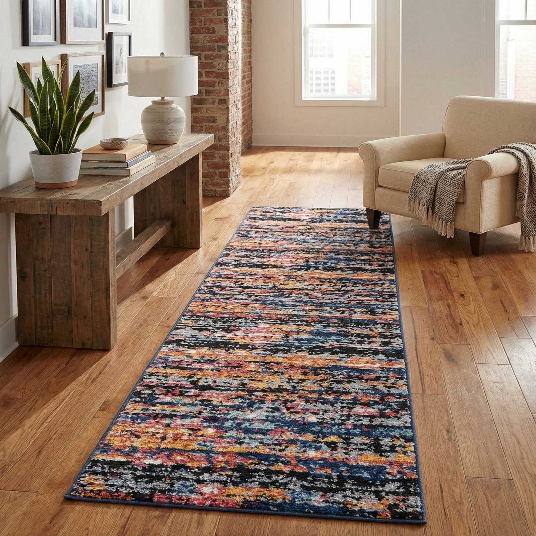 This runner works well in a variety of interiors: place it in a long entry or hallway to add color and energy against hardwood floors, layer it in a modern living room to anchor a neutral sofa and navy accents, or use it in a contemporary kitchen to bring warmth and pattern to a galley layout. It pairs easily with metal and wood furnishings, bold accent pillows, and mid-century or industrial pieces for a pulled-together, lived-in look.