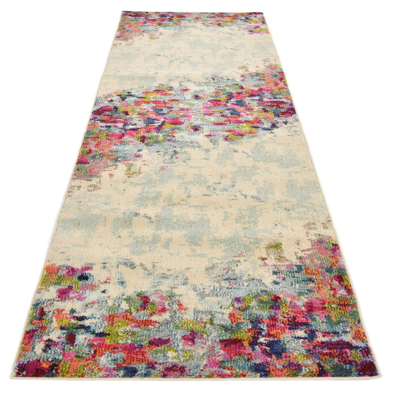 A 10 ft runner rug with a multi-colored abstract floral pattern on a light beige and gray background, ideal for a hallway.