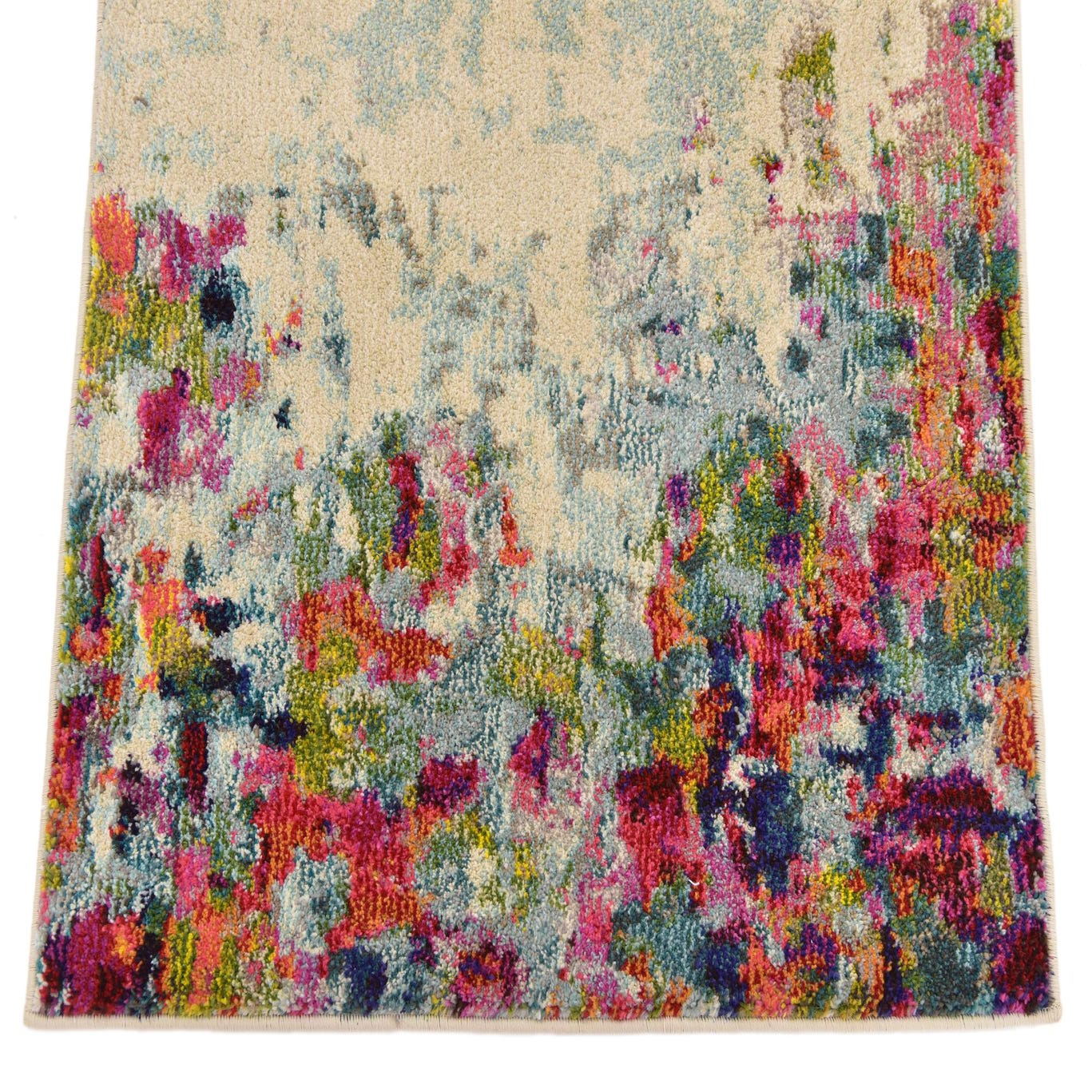 A painterly, abstract runner with a multi background layered in cream and gray undertones, punctuated by vivid clusters of blue, navy, green, gold, orange, purple, red and pink. The pattern reads like scattered brushstrokes and color washes that gather more densely at the ends and disperse toward the center, creating a sense of movement along the length. Machine-made from 100% polypropylene, the low-profile pile feels soft underfoot with a slightly dense weave that gives visible texture and a gentle sheen.