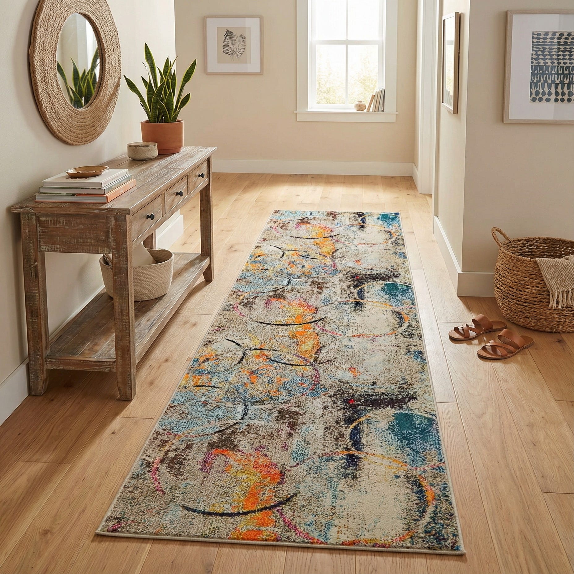 This runner works well where you want a dose of color and movement without dominating the room — think hallways, entryways, kitchen galleries or a narrow corridor beside a living area. It pairs naturally with warm wood tones and neutral upholstery, and also complements mid-century modern, contemporary eclectic, or transitional interiors that welcome a playful, modern pattern. Use it to tie together scattered accents of blue, gold or coral, or to bring energy to a pared-back space.