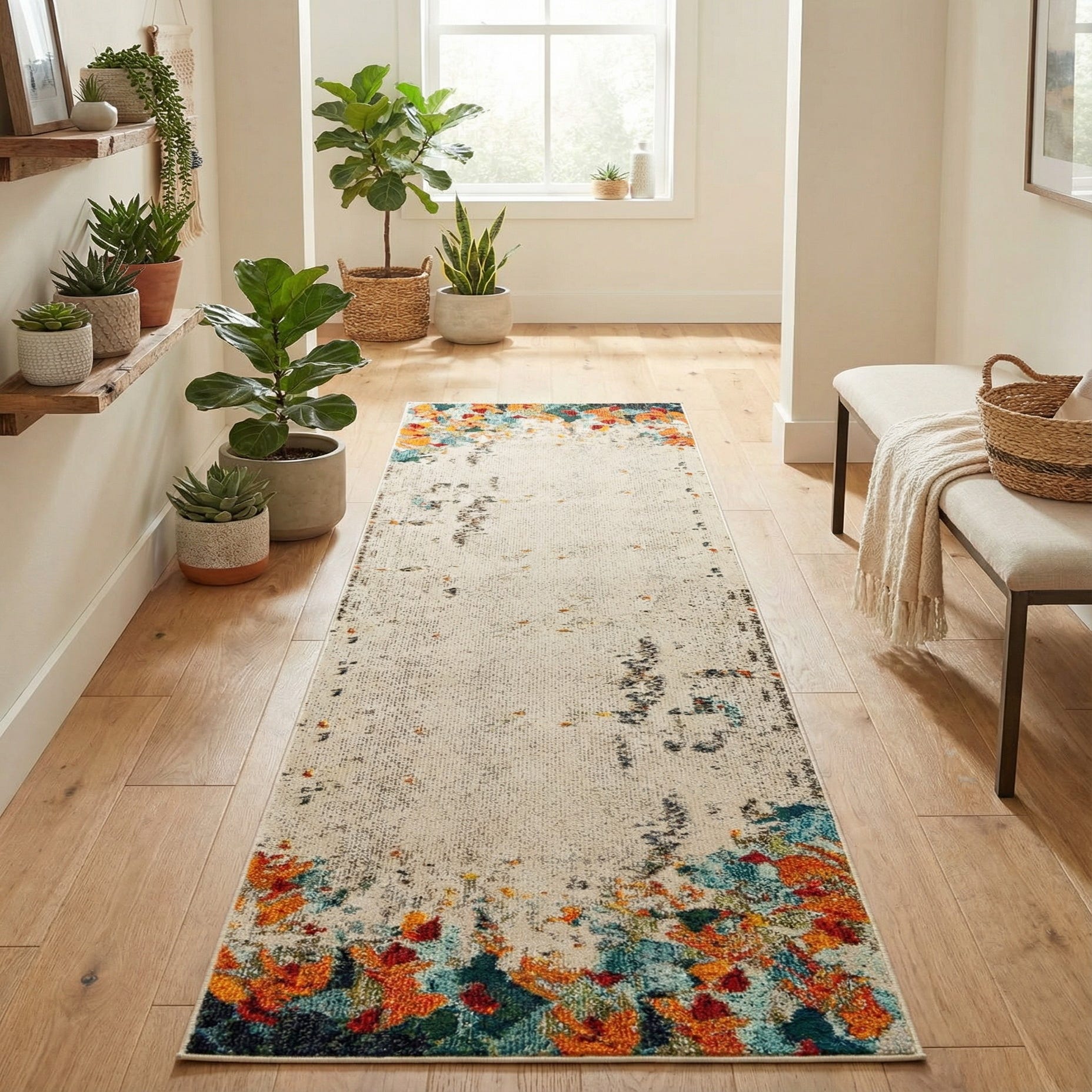 Place this runner in a hallway or entry to add a splash of color or use it along a kitchen aisle to tie together warm woods and matte black hardware. It pairs well with contemporary and transitional schemes, complements eclectic or boho layers of textiles, and can ground a neutral living area when run in front of a sofa or console. The varied palette makes it simple to pick up accent colors from existing decor—try coordinating with jewel-toned pillows, muted gray upholstery, or warm brass fixtures.