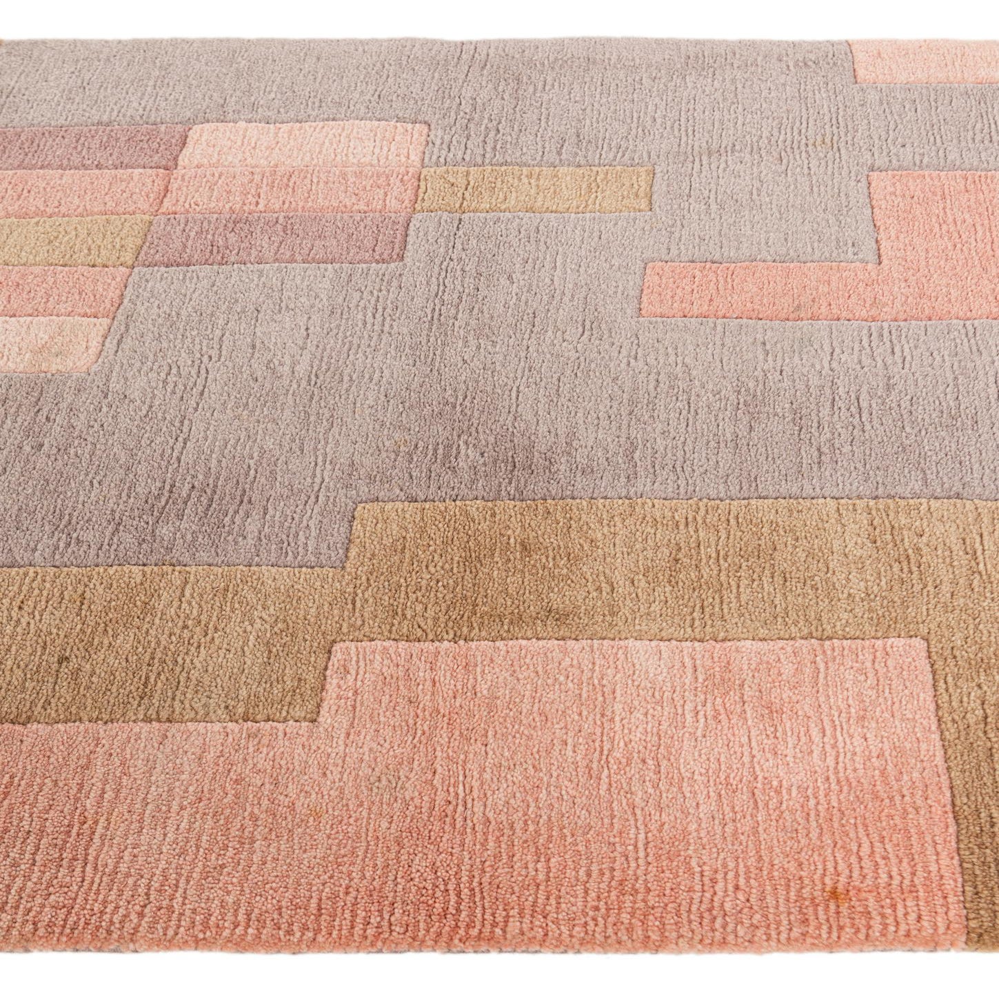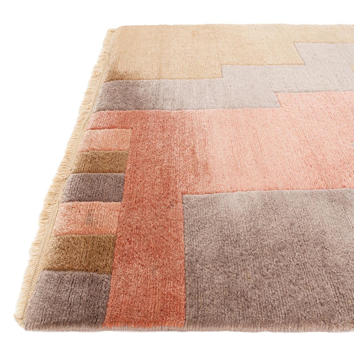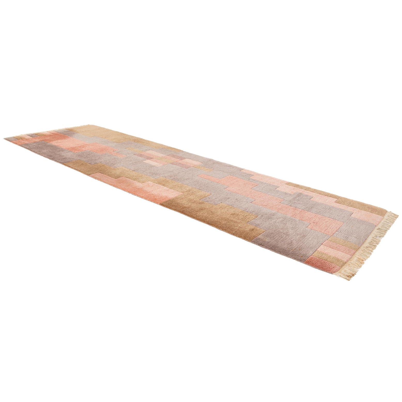 A 10 Ft runner rug with a modern abstract pattern in shades of brown, gray, and various pinks, featuring a medium pile and fringed ends.