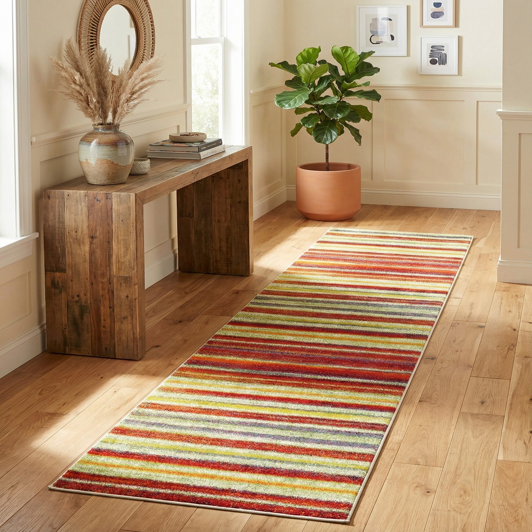 This runner brings color and movement to narrow spaces like hallways, entryways or kitchen corridors, and it pairs well with natural wood floors, clean white cabinetry, or neutral upholstered seating to let the stripes take center stage. It suits eclectic, casual contemporary, and mid-century-inspired interiors where layered color and pattern add personality, and it also works as an accent in a vibrant home office or play area.