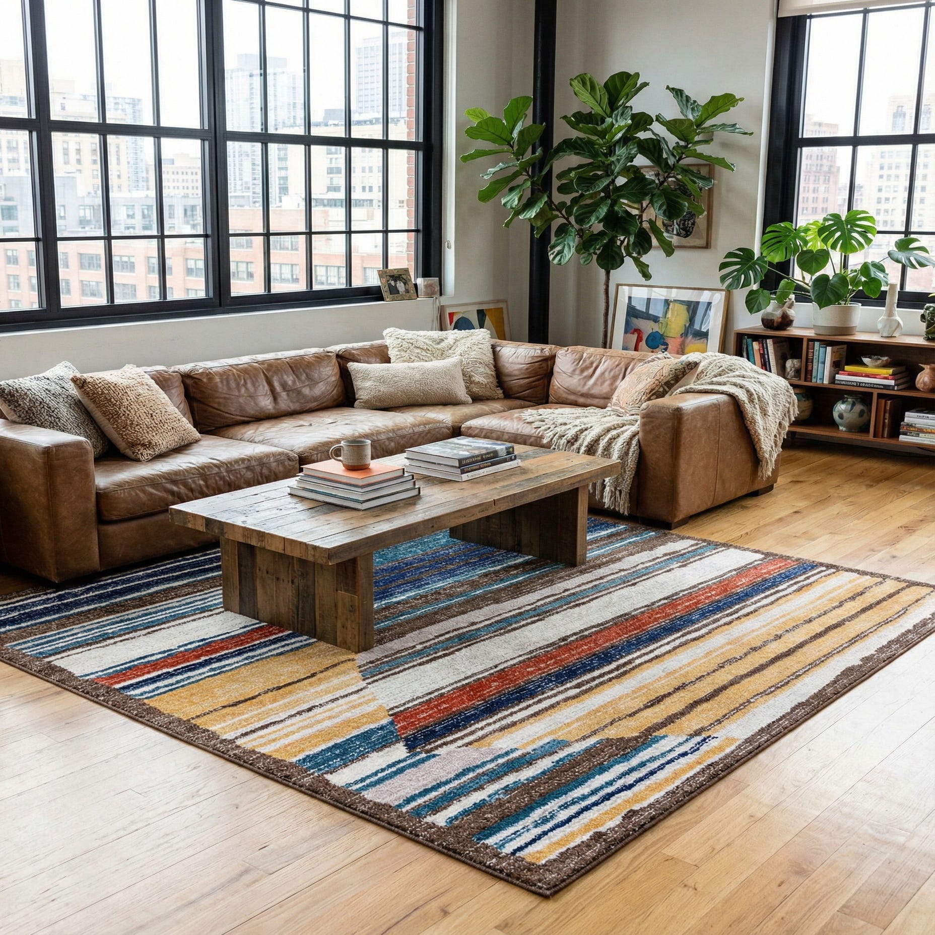 Machine-made polypropylene construction produces a low-pile surface that feels smooth and slightly dense underfoot while holding the pattern’s crisp lines. This rug works well to anchor a living room seating area, add color to a bedroom, or define a casual dining space. Pair it with warm wood tones and leather, navy or ivory upholstery, woven textures like rattan, or clean-lined mid-century pieces to complement the rug’s mix of cool blues and warm rust and yellow accents.
