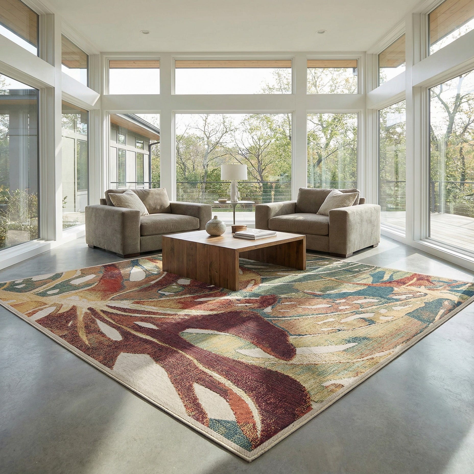 This rug works well as an anchor for an alfresco seating area or a covered patio where color and pattern can stand up to the open-air vibe. Pair it with natural wood or rattan furniture and navy or beige cushions for a cohesive look, or use it to add warmth and contrast to a sunroom or lanai with neutral upholstery and terracotta planters. It also complements casual coastal, tropical, and modern farmhouse schemes that favor mixed textures and layered colors.