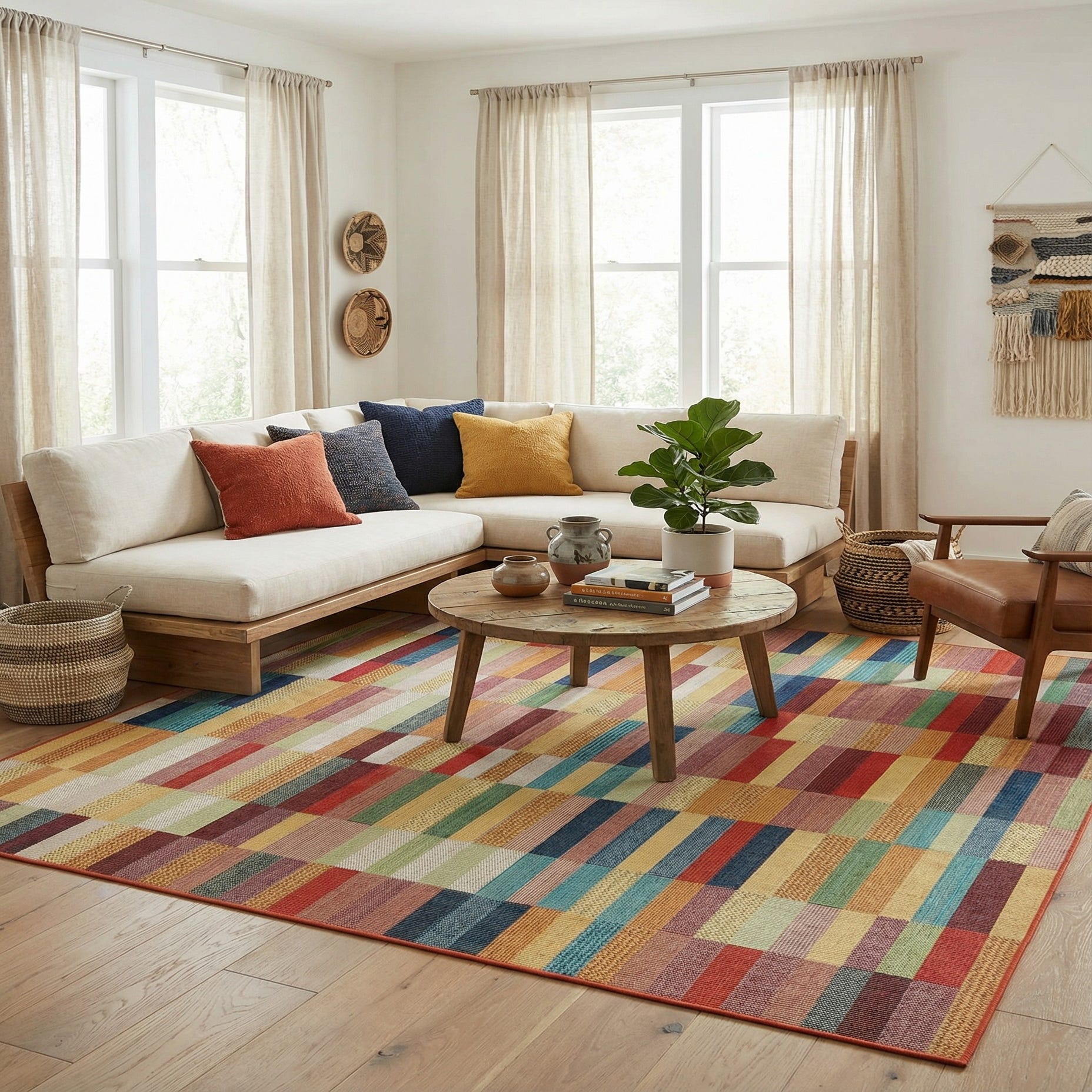 This rug brings color and structure to outdoor and transitional spaces — place it under a dining set on a covered patio, layer it in a sunroom with rattan seating, or use it to anchor a modern living area with neutral sofas and metal or wood accents. It also pairs well with coastal and mid-century furnishings, where the varied hues can pick up existing accent pillows or art without overwhelming the room.