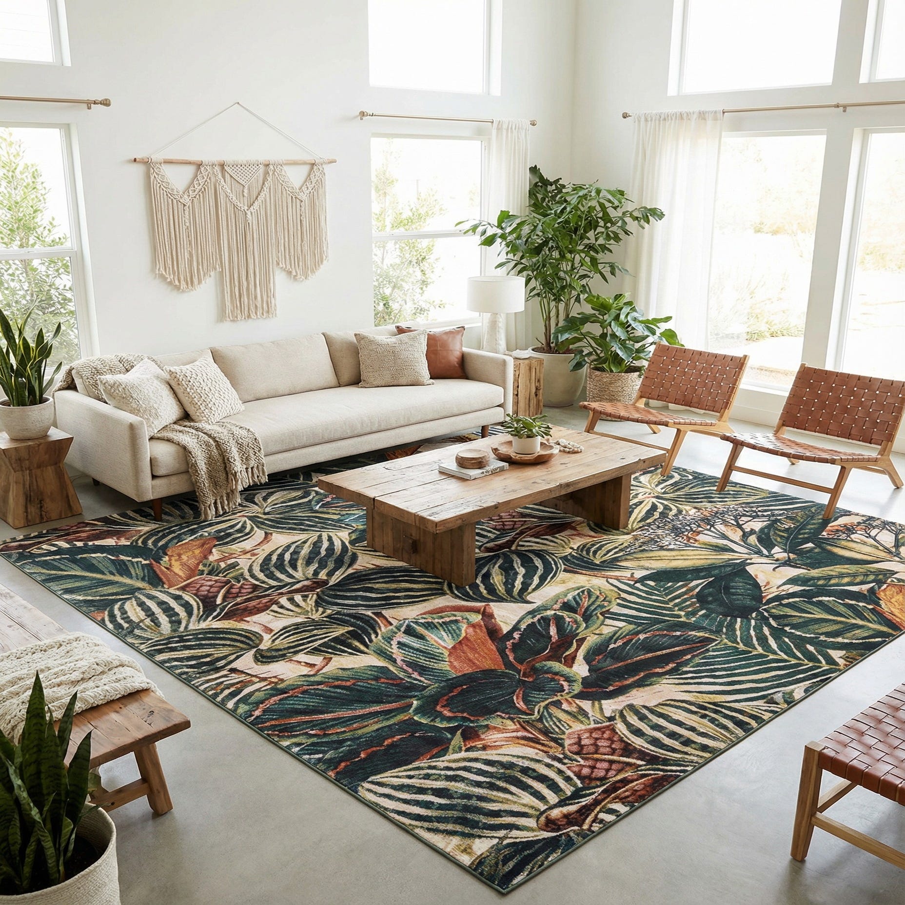 A machine-made rug crafted from 100% polypropylene, this piece presents a layered botanical pattern of overlapping leaves and floral accents. Large, striped leaves in hunter green and olive sit alongside broader brown and rust-red foliage, all outlined with ivory and beige highlights against a multi background. The design balances dense visual movement with defined shapes, giving a natural, garden-inspired look that reads both organic and structured. The pile is low to medium and tightly woven, offering a smooth, slightly cushioned hand that holds color definition and pattern crisply.