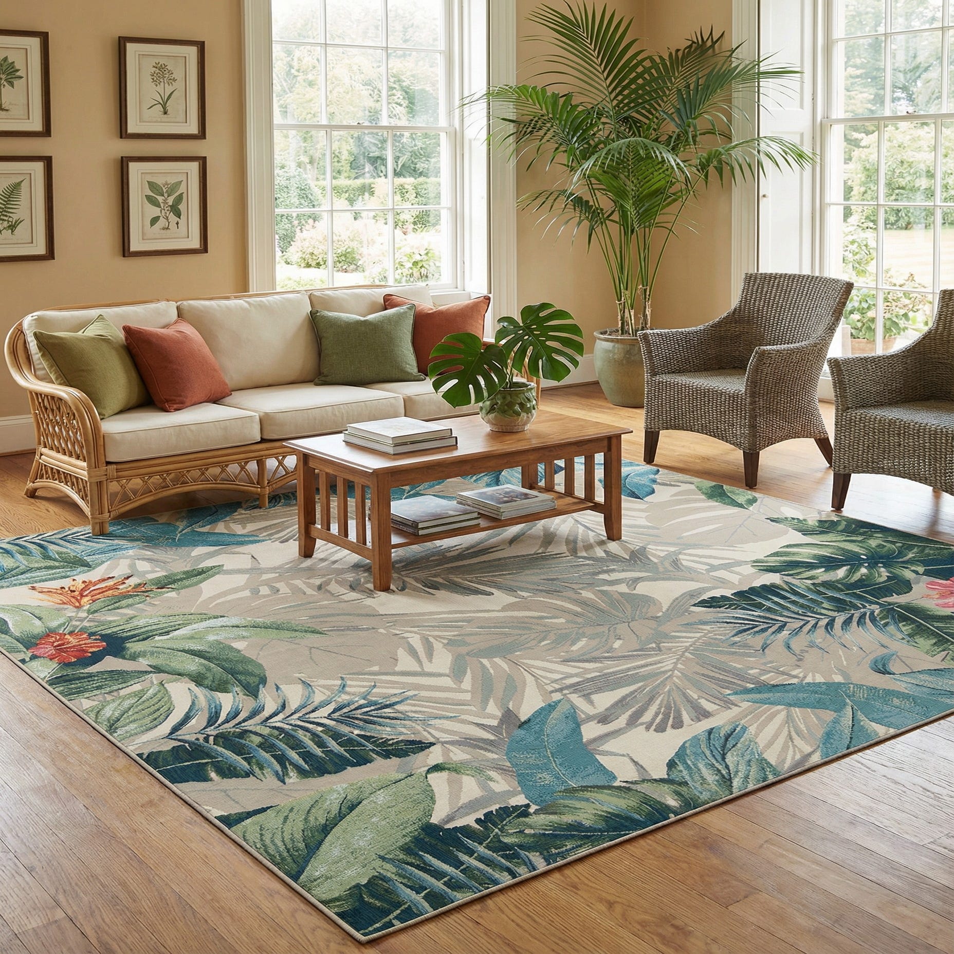 This rug works well in covered outdoor living areas, a sunroom, or a poolside lounge where a lively tropical look is desired without heavy texture. Pair it with rattan or teak seating, neutral cushions, and plants to amplify the botanical theme, or use it to bring color to a coastal-style patio, modern terrace, or transitional dining space.