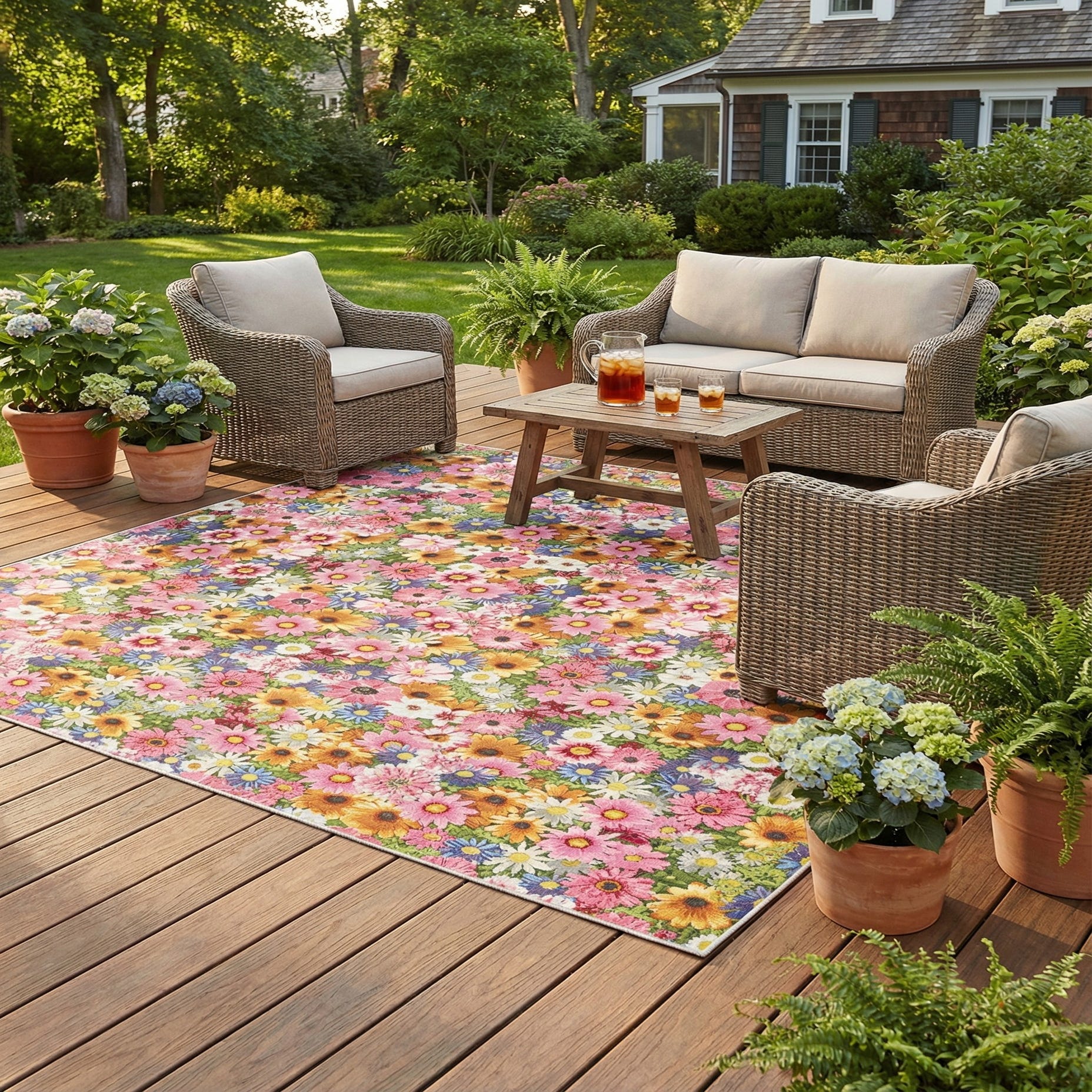 A dense all-over floral pattern fills this outdoor rug with overlapping blossoms and leafy accents, set on a multi-colored background. Pink and yellow blooms take center stage, joined by ivory daisies, light blue and violet accents, olive and green foliage, and warm brown centers with small red highlights. The machine-made construction (75% polypropylene, 25% polyester) produces vivid color definition and crisp floral outlines while keeping the surface low-profile. Underfoot the rug has a slightly firm, springy feel with a subtle texture from the short pile — enough to register under bare feet or shoes without overwhelming the space.