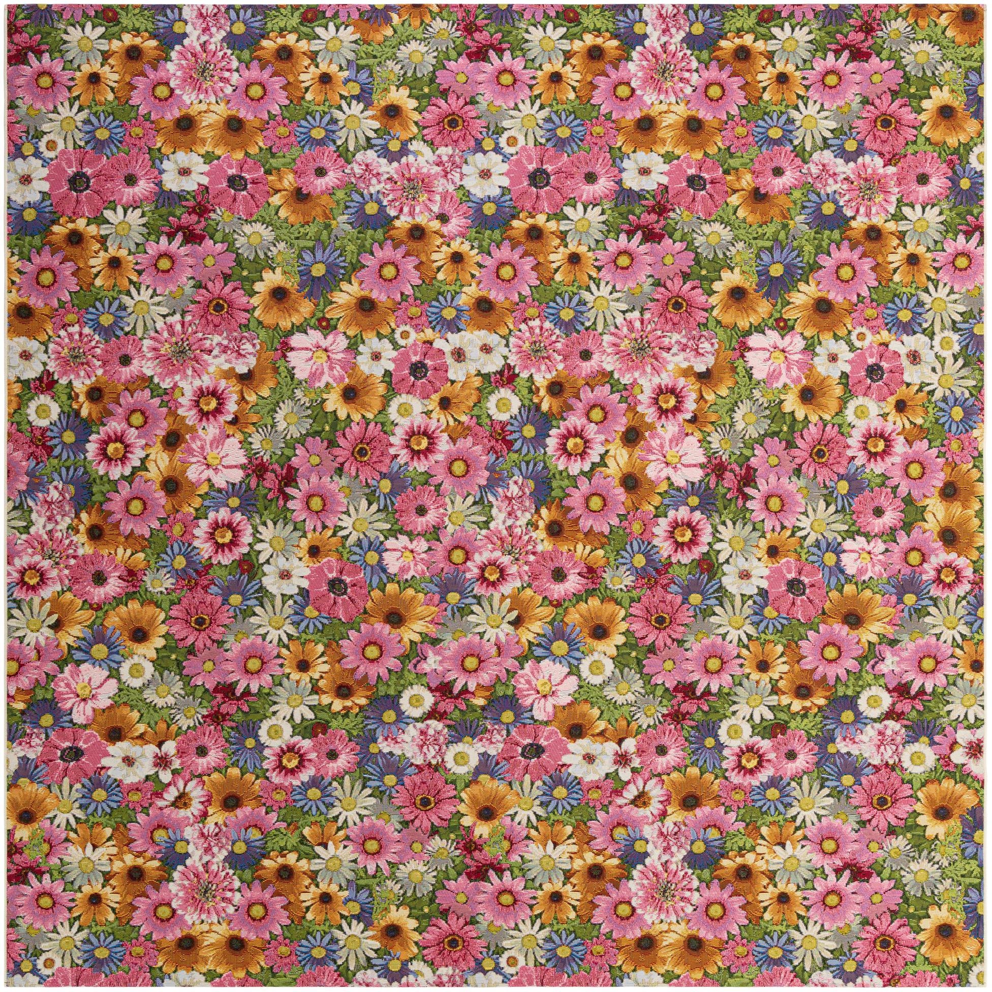 This pattern works well on a covered patio or sunroom to bring garden color into an outdoor living area, or layered beneath a casual dining table to anchor a bright, cottage-style kitchen. It also pairs nicely with rattan or painted wood furniture for a relaxed, vintage-inspired vibe, or with neutral seating and simple linens to let the floral motif act as the room’s focal point.