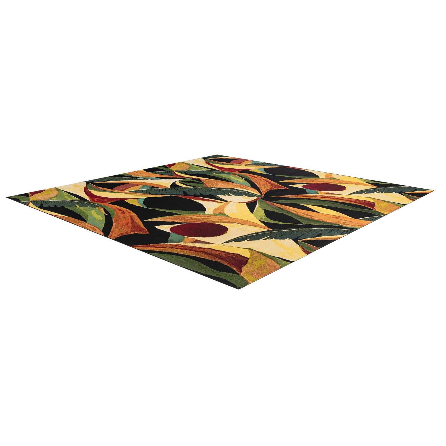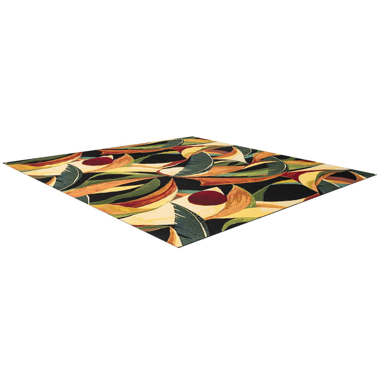 A 10'x10' square multi-colored rug with a modern floral pattern, featuring large green, orange, yellow, and red leaves on a black background.