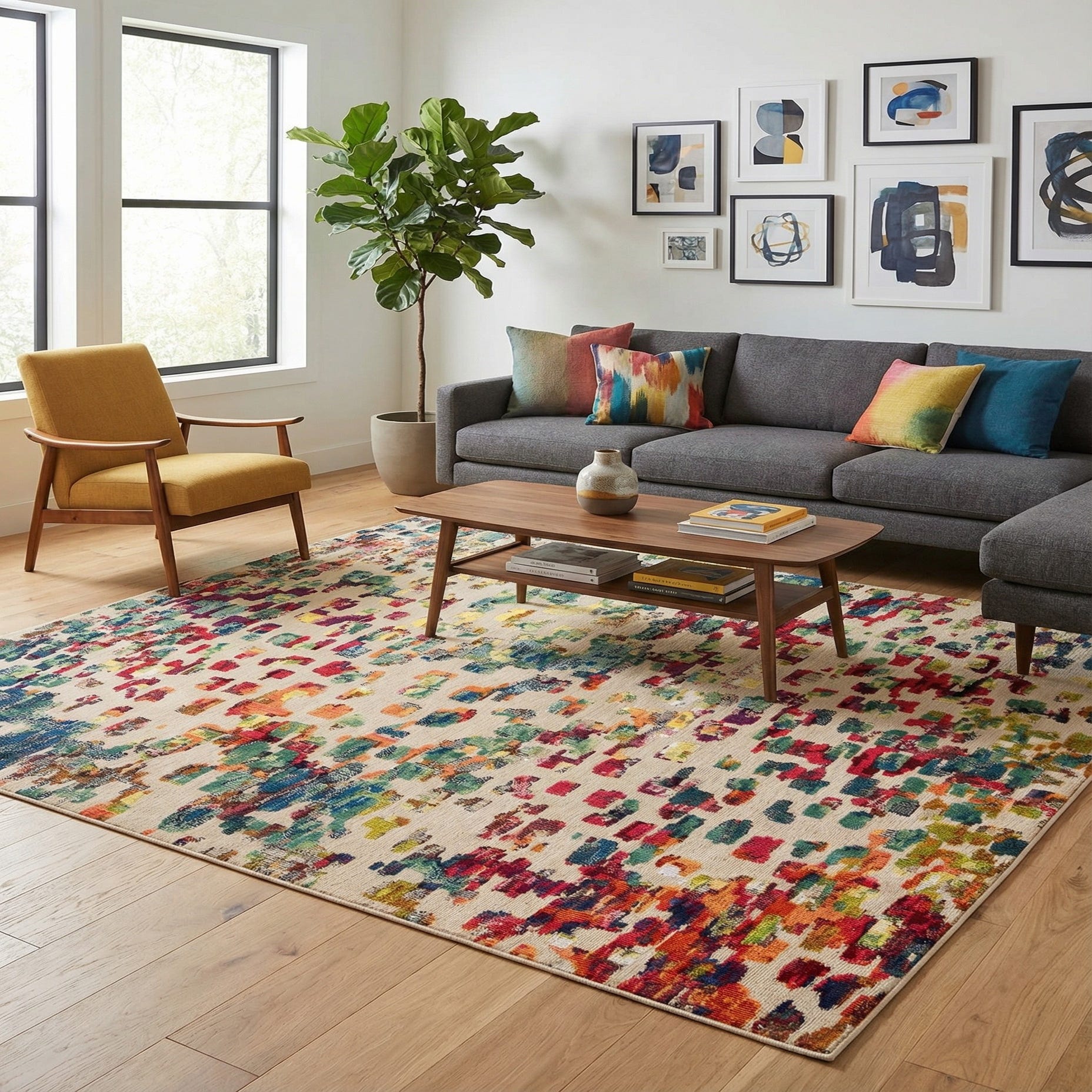 A 10'x10' square modern multi-colored rug with a textured abstract pattern of red, blue, green, and yellow on a beige background.