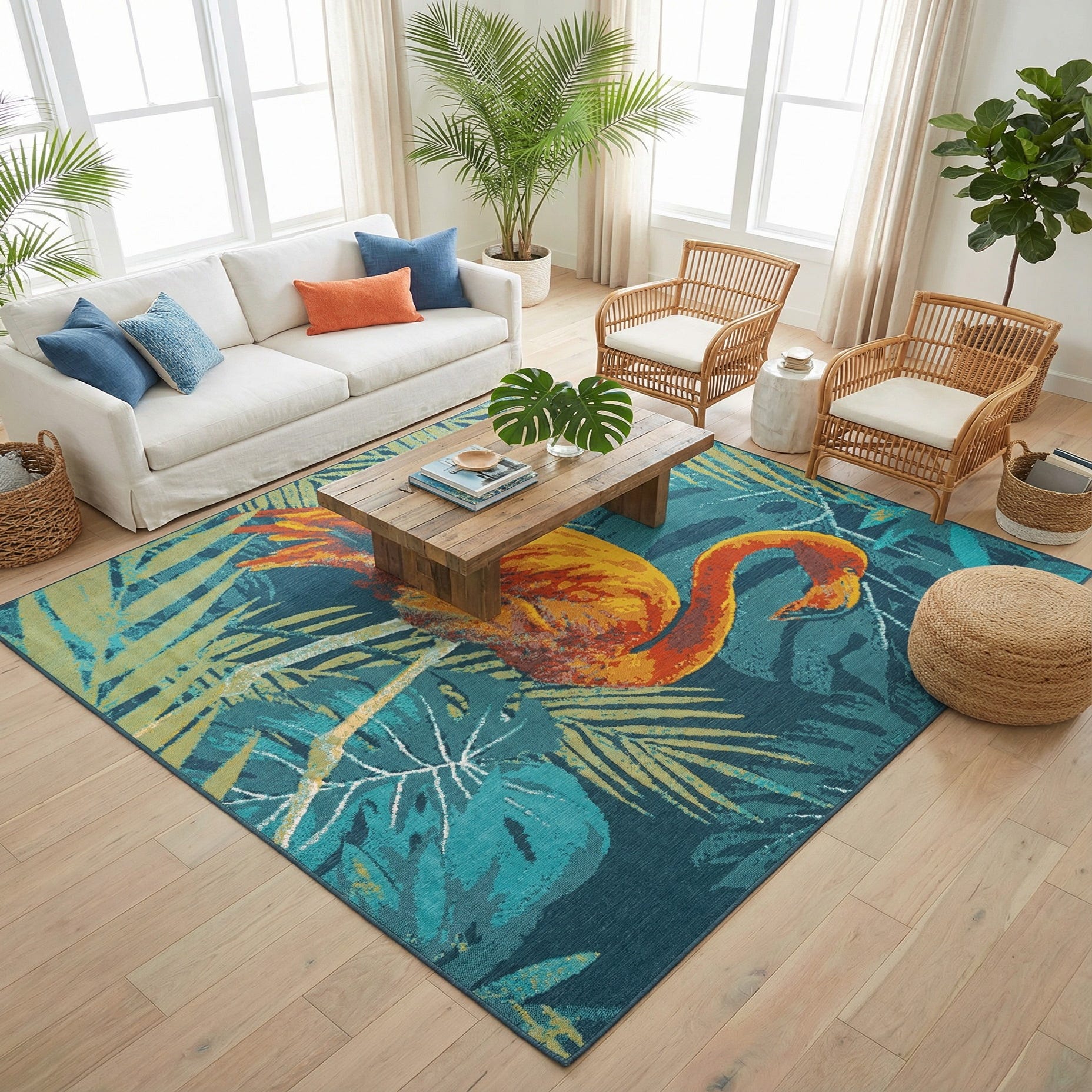 A vibrant square rug featuring a large orange flamingo against a background of teal and lime green tropical leaves.